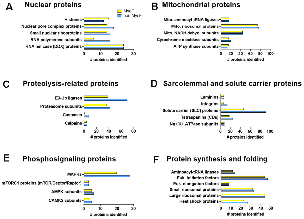 Aside from using PANTHER protein classifications, we wanted to present the depth of proteins detected based on processes relevant to muscle biology. Through manual interrogation we found that both fractions contained proteins found in nuclei that regulate chromatin structure and gene expression (Figure 2A), mitochondrial proteins related to oxidative phosphorylation and mitochondrial protein synthesis (Figure 2B), proteolysis-related proteins (Figure 2C), proteins localized to the sarcolemma and solute carrier proteins (Figure 2D), exercise-relevant phosphosignaling proteins (Figure 2E), and proteins associated with protein synthesis (Figure 2F).
