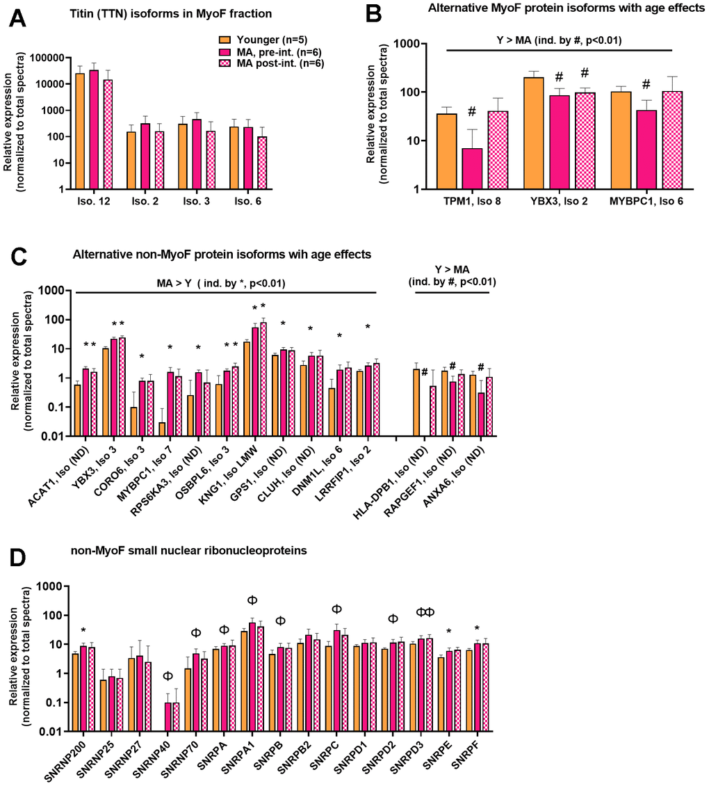 The enhanced depth of detection provided by proteomics revealed the presence of numerous isoforms in both protein fractions; specifically, there were 175 isoforms for 82 MyoF proteins and 375 isoforms for 173 non-MyoF proteins. The MyoF proteins with the most isoforms included titin (TTN), myosin-binding protein C (MYBPC), and MICOS complex subunit MIC60 (IMMT); each of these targets had four isoforms detected. Given the vast research interest in titin [29, 30], associated isoform data are plotted in Figure 3A; notably no significant aging or training effects were noted (p>0.01 for all comparisons). The non-MyoF proteins with the most isoforms included Gelsolin (GSN, four isoforms), IMMT (4 isoforms), and Reticulon-4 (4 isoforms); again, no significant age effects were noted for these targets (data not plotted).