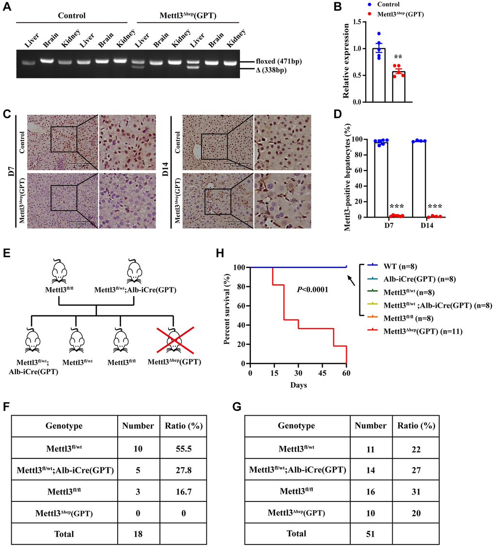 Hepatocyte-specific and homozygous ablation of METTL14 by Alb-iCre mice (GPT) also results in postnatal lethality