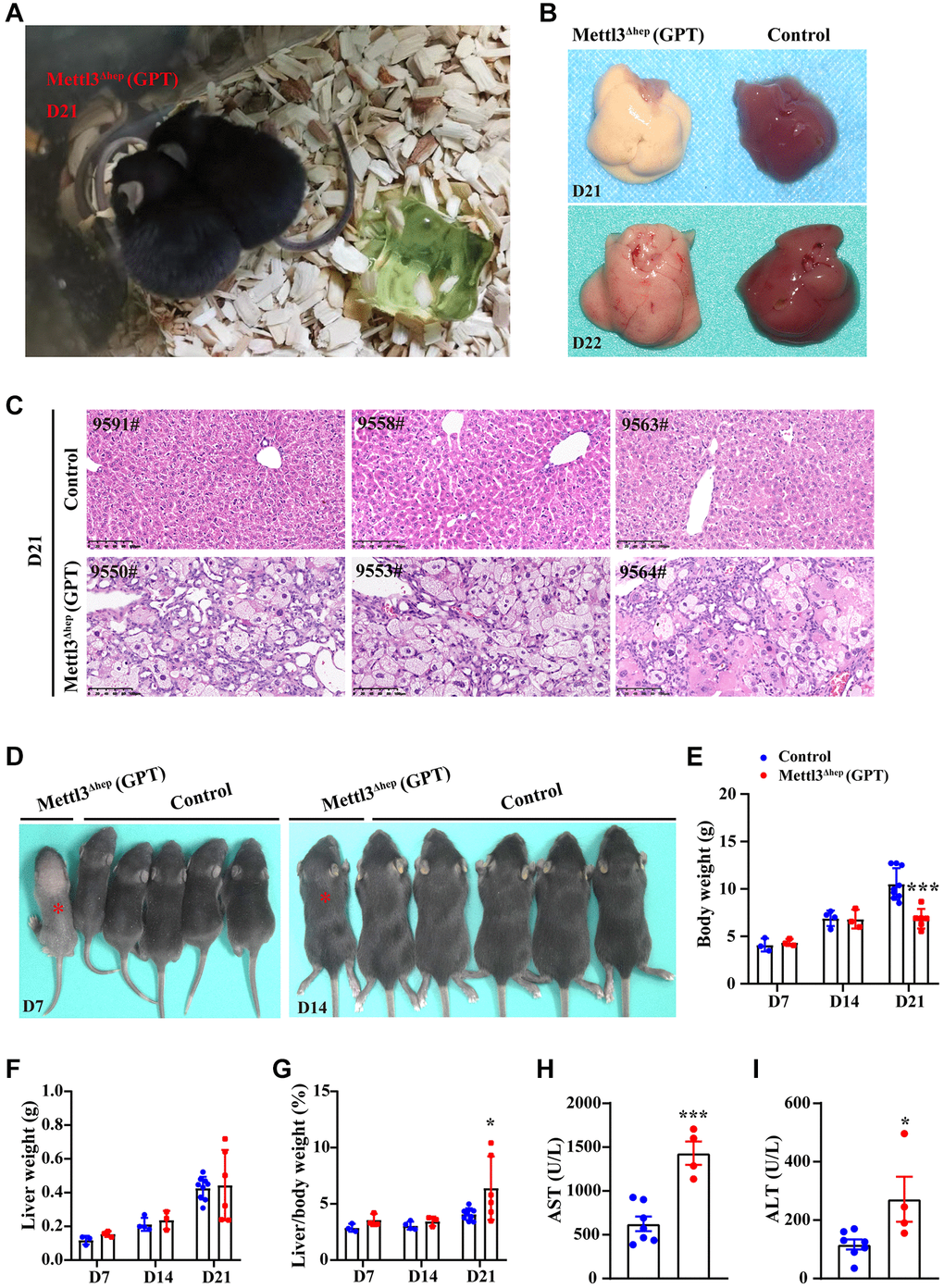 To fully study the exact role of METTL3 in liver organogenesis, we further dissected the livers of control mice and METTL3Δhep mice (GPT) at different time points after birth. The body weight (Figure 2D, 2E), liver weight (Figure 2F) and liver-to-body weight ratio (Figure 2G) were comparable between control mice and METTL3Δhep mice (GPT) at both 7 and 14 days postnatally. METTL3Δhep mice (GPT) at 21 days postnatally are lighter in body weight than control mice (Figure 2E), while the liver weight to body weight ratio of METTL3Δhep mice (GPT) is slightly increased (Figure 2G). Moreover, compared with control group, the activities of serum alanine aminotransferase (ALT) and aspartate aminotransferase (AST) in METTL3Δhep mice (GPT) were significantly increased (Figure 2H, 2I), indicating that hepatocyte-deletion of METTL3 by Alb-iCre mice (GPT) results in the progressive liver injury.