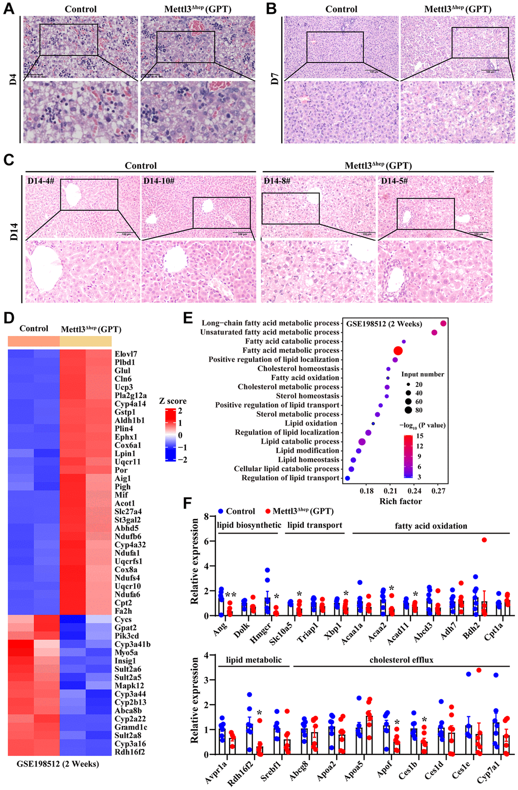 To dissect the molecular events underlying the abnormal lipid accumulation in the hepatocytes of 14-day-old METTL3Δhep mice (GPT), we further analyzed a publicly available gene expression dataset (from GEO database: GSE198512) of the liver of 14-day-old METTL3Δhep mice (GPT). As we expected, GO analysis of the 2312 genes displaying significant changes in the expression of 14-day-old METTL3Δhep mouse liver (GPT) demonstrated a dramatic enrichment for 49 genes (up-regulated: 32; down-regulated: 17) (Figure 3D and Supplementary Table 3) with functions typically associated with the abnormalities in hepatic lipid metabolism including long-chain fatty acid metabolic process, unsaturated fatty acid metabolic process, fatty acid catabolic process, fatty acid metabolic process, positive regulation of lipid localization, cholesterol homeostasis, fatty acid oxidation, cholesterol metabolic process, sterol homeostasis, positive regulation of lipid transport, sterol metabolic process, lipid oxidation, regulation of lipid localization, lipid catabolic process, lipid modification, lipid homeostasis, cellular lipid catabolic process and regulation of lipid transport (Figure 3E and Supplementary Table 4).