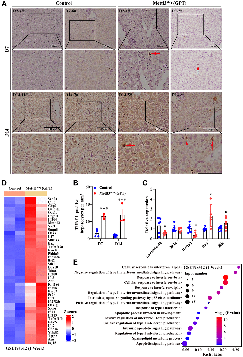 RNA-seq results from METTL3Δhep mouse liver (GPT) revealed the significant upregulation of a number of pro-apoptosis and interferon response genes such as Bax, Tnfrsf10b, Tnfrsf12a, Smpd1, Ifi204, Ifi206, Ifi208, Ifi211, Ifi213, Ifi27l2a, Ifi27l2b, Ifit1, Ifit3, Irf7, Isg15, Oas1a, Oas1g and Oas3 (Figure 4D and Supplementary Table 1). All GO terms representing biological processes listed in Figure 4E and Supplementary Table 2 were related to apoptosis, including apoptotic signaling pathway, intrinsic apoptotic signaling pathway, intrinsic apoptotic signaling pathway by p53 class mediator, apoptotic process involved in development and sphingolipid metabolic process, and interferon response, including response to interferon-alpha, response to interferon-beta, response to type I interferon, cellular response to interferon-alpha, cellular response to interferon-beta, regulation of type I interferon-mediated signaling pathway, positive regulation of type I interferon-mediated signaling pathway, negative regulation of type I interferon-mediated signaling pathway, regulation of type I interferon production, positive regulation of type I interferon production and positive regulation of interferon-beta production.