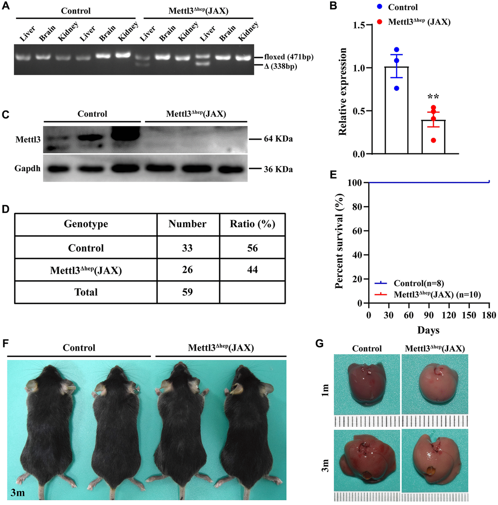 Furthermore, to assess the knockout efficiency of METTL3 in liver, the main organ and tissue genomic DNA, including the liver, was subjected to PCR using the following primer pairs to amplify 338bp METTL3 mutant fragment, F1: GTGCTGTGCCTTTCTTAG, R1: AGCGTCACTGGCTTTCAT, and R2: TTCTTGTTCTCCCCCAAT. A 338bp band can be only observed in tissues with successful deletion of METTL3.
