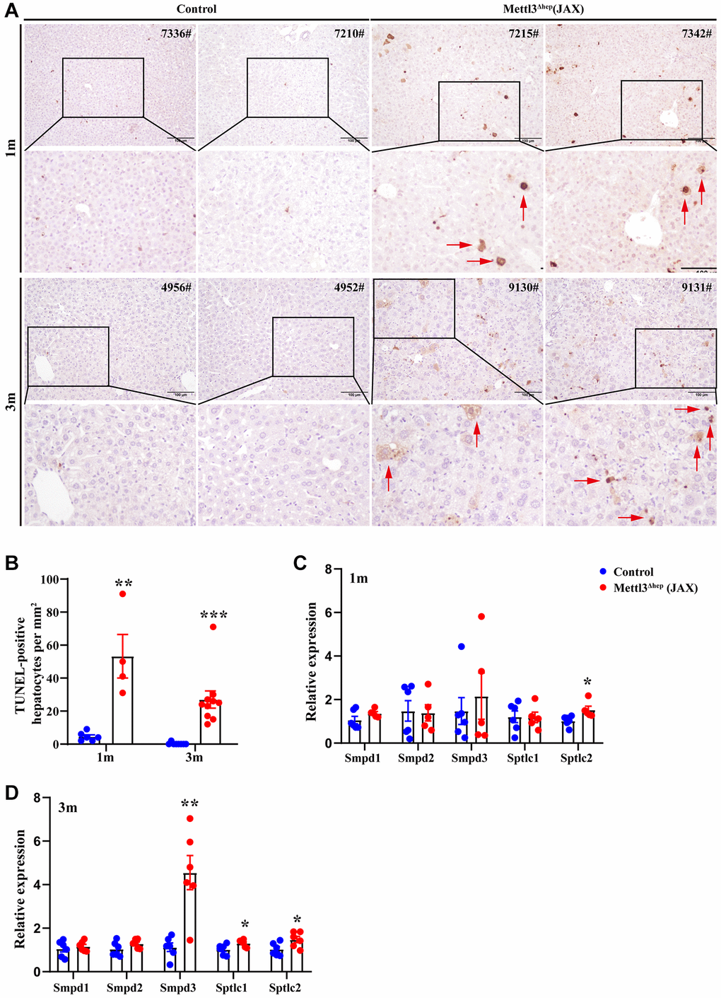 As described above, the eosinophilic necrosis (i.e., apoptosis) was observed in scattered hepatocytes of METTL3Δhep mice (JAX) (Figure 6A). Therefore, we evaluated whether these hepatocytes of METTL3Δhep mice (JAX) underwent apoptosis induced by hepatocyte-specific METTL3 loss. The nuclei of >0.6–4% of the hepatocytes of METTL3Δhep mice (JAX) at 1 month or 3 months after birth were condensed because of apoptosis, which was demonstrated by TUNEL staining (Figure 6A, 6B).
