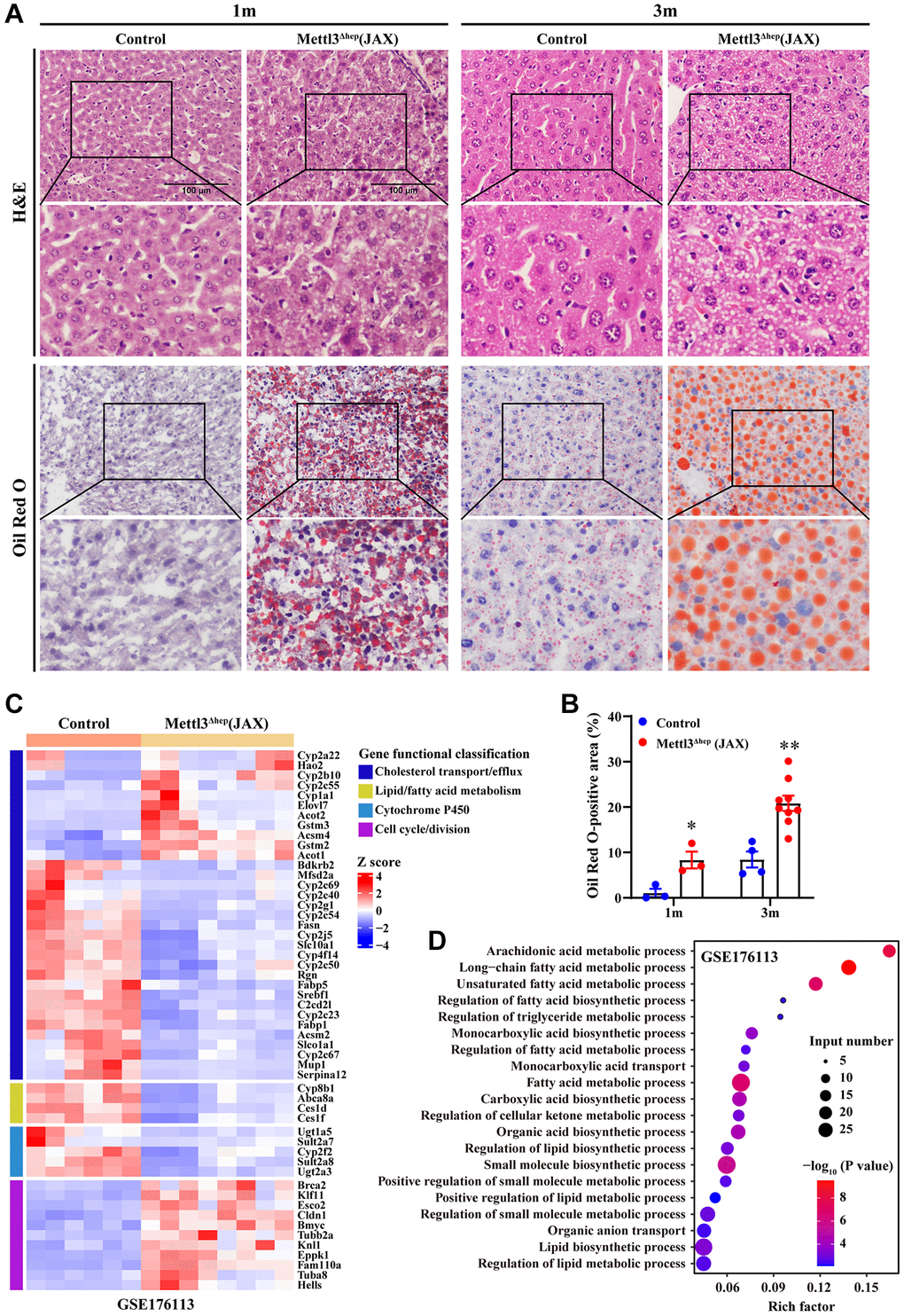The livers of 1-month-old and 3-month-old METTL3Δhep mice (JAX) exhibited a more yellowish appearance than in the control group (Figure 5G). Consistent with this, H&E staining of liver tissues of METTL3Δhep mice (JAX) at 1 month and 3 months after birth demonstrated the diffuse microsteatosis of hepatocytes (Figure 7A). Furthermore, liver tissue slices stained with Oil-Red-O (ORO) also revealed that more red lipid droplets were deposited in the hepatocytes of METTL3Δhep mice (JAX) at both timepoints (Figure 7A, 7B). Summarily, these findings suggest abnormal lipid accumulation in the hepatocytes of METTL3Δhep mice (JAX).