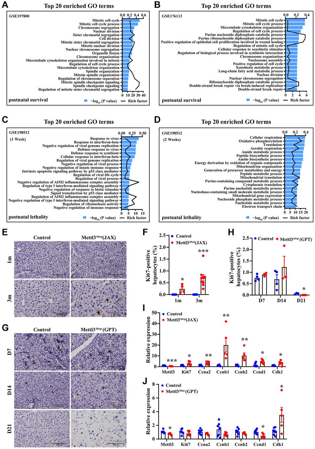 Unexpectedly, GO analysis illustrated that DEGs in the livers of 1 week-old and 2 week-old METTL3Δhep mice (GPT) showing postnatal lethality are not functionally enriched in terms associated with cell cycle, cell division, mitosis, microtubule cytoskeleton organization, spindle organization, chromatin segregation and organization, and nuclear division (Figure 8C, 8D and Supplementary Tables 9 and 10), consistent with the loss of compensatory proliferation of the hepatocytes of METTL3Δhep mice (GPT) observed in vivo (Figure 8G, 8H, 8J).