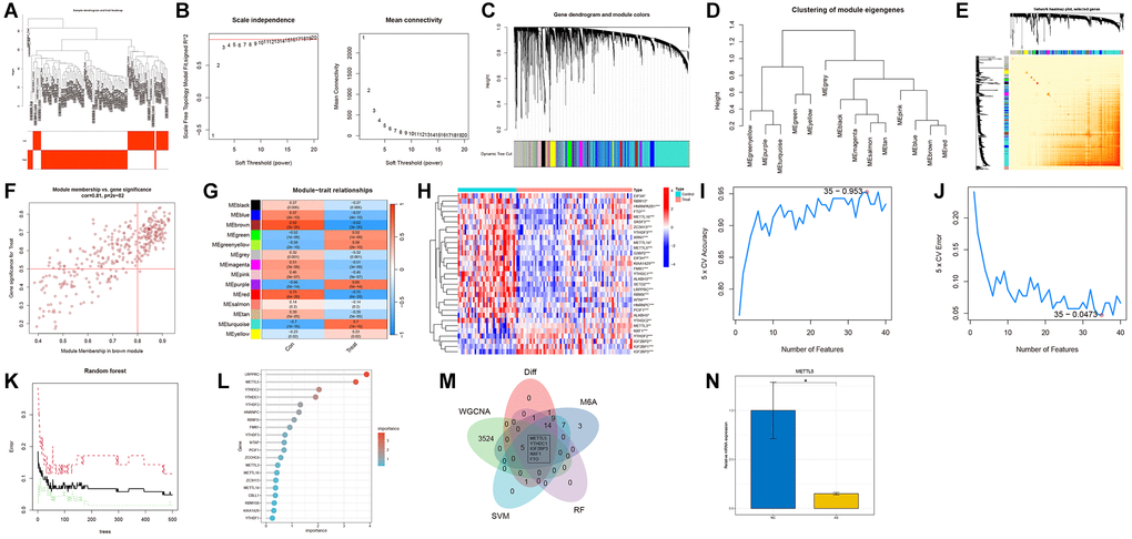 The RF algorithm, a powerful and widely applicable machine learning algorithm, is used for classification and regression analysis [18]. SVM is a type of generalized linear classifier that operates in a supervised learning manner for binary classification of data [19]. AS-associated m6A regulators were screened using the RF [18] and SVM-Recursive Feature Elimination (RFE) [19] algorithms. The RF classifier was generated using the R package “Random Forest,” while the SVM classifier was generated using the R package “e1071”.