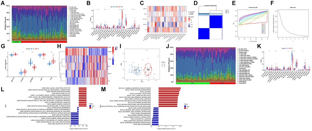 Different m6A clusters associated with AS were identified using a consensus cluster algorithm based on the expression levels of five m6A regulators. When the K value was 2, the consensus algorithm categorized patients with AS into two m6A subtypes (Figure 2D–2F). Compared with those in cluster 1, the expression levels of METTL5, YTHDC1, and FTO were upregulated in cluster 2 (Figure 2G, 2H). PCA (Figure 2I) revealed that the two m6A subtypes exhibited distinct biological processes. CIBERSORT analysis demonstrated that the infiltration levels of plasma cells, resting memory CD4+ T cells, activated natural killer (NK) cells, M1 macrophages, and resting mast cells were upregulated, whereas those of M0 macrophages were downregulated in cluster 1 (Figure 2J, 2K).