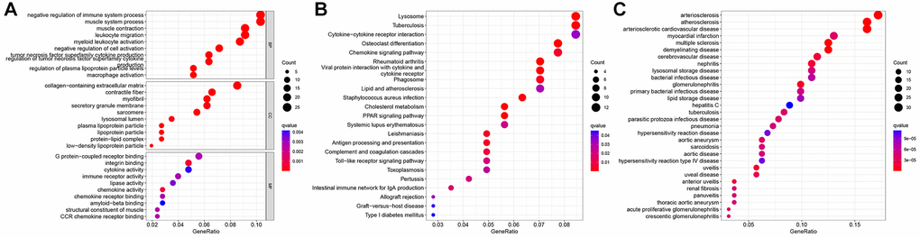 Functional enrichment analysis revealed that DEGs between the two clusters were enriched in macrophage activation, muscle system processes, and negative regulation of the immune system (Figure 3A). KEGG pathway enrichment analysis demonstrated that DEGs were enriched in the chemokine signaling, PPAR signaling, Toll-like receptor signaling, and lipid and AS pathways (Figure 3B). DO analysis revealed that DEGs were associated with arteriosclerosis, AS, arteriosclerotic heart disease, and aortic aneurysm (Figure 3C).