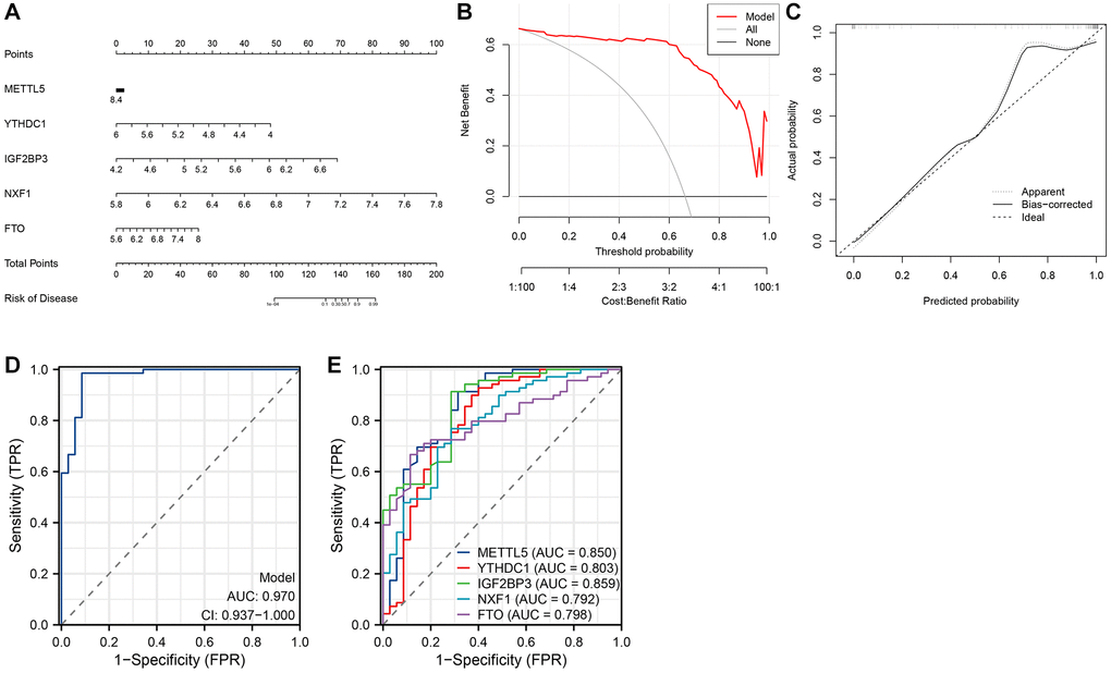 A nomogram based on M6ARGs was constructed to evaluate the risk of developing AS (Figure 4A). DCA revealed the enhanced predictive ability of the nomogram (Figure 4B). As shown in Figure 4C, the predicted risk was consistent with the actual risk. The five-m6A regulator-based model demonstrated enhanced diagnostic efficacy (Figure 4D). The ROC curve revealed that the area under the curve (AUC) values for YTHDC1, IGF2BP3, NXF1, FTO, and METTL5 were 0.803, 0.859, 0.792, 0.798, and 0.850, respectively (Figure 4E).