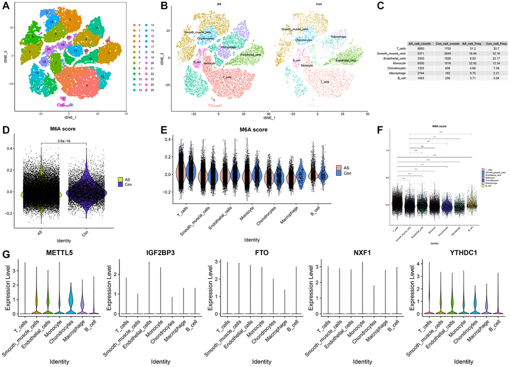 After pre-processing the GSE159677 single-cell dataset, the combined data of AS and adjacent healthy tissues were subjected to t-distributed stochastic neighbor embedding (t-SNE) non-linear dimension reduction. The segregation of all cells revealed 26 cell subclusters (Figure 5A). The “FindAllMarkers” function was used to identify DEGs in each cluster (logFC = 0.25). The “singleR” function was used to identify the following seven cell types: B cells, T cells, chondrocytes, smooth muscle cells (SMCs), macrophages, endothelial cells (ECs), and monocytes (Figure 5B). Additionally, the proportions of each cell type in AS and healthy tissues were examined. Compared with those in healthy tissues, the proportions of T cells, monocytes, and macrophages were upregulated and the proportions of SMCs and ECs were downregulated in AS tissues (Figure 5C). The m6A scores were significantly different between AS and healthy tissues (Figure 5D). The levels of m6A regulators in seven cell types are shown in Figure 5E. The m6A regulator levels significantly varied between the seven cell types (Figure 5F). METTL5 was upregulated in specific cell types, including macrophages, SMCs, and ECs (Figure 5G).