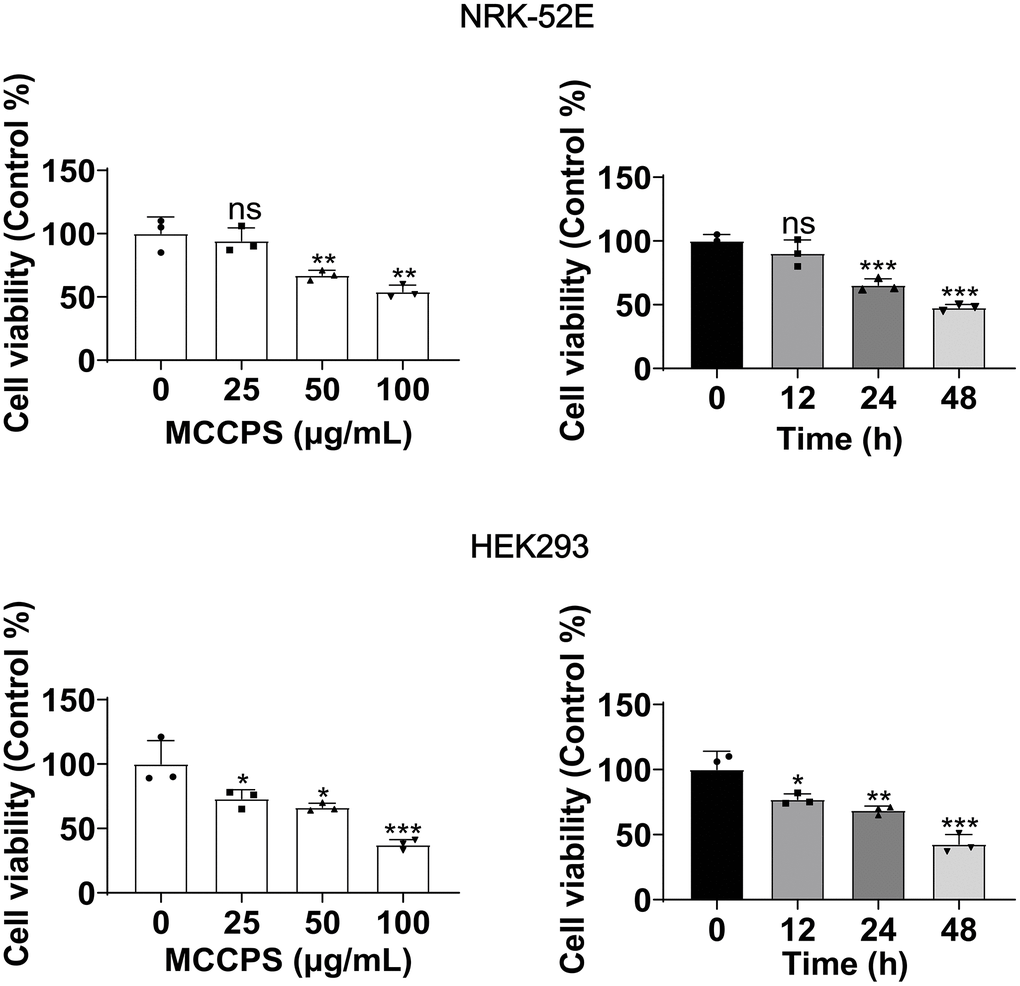 Here, we evaluated the effects of MCCPs on the proliferation of NRK-52E and HEK293 cells by treating cells with 0 μg/L, 25 μg/L, 50 μg/L and 100 μg/L of MCCPs for 24 h (The selection of the concentration of MCCPs was based on a previous literature reported [12]), the results showed that the renal cell viability decreased dose-dependently with the increase of the concentration of MCCPs, and that 50 μg/mL MCCPs obviously inhibited the proliferative viability of NRK-52E cell and HEK293. Next, NRK-52E and HEK293 cells were selected to be treated with 50 μg/mL MCCPs for 0 h, 12 h, 24 h and 48 h, it was found that the proliferative activity of NRK-52E and HEK293 cells was gradually decreased with the prolongation of the stimulation time of MCCPs (Figure 1).