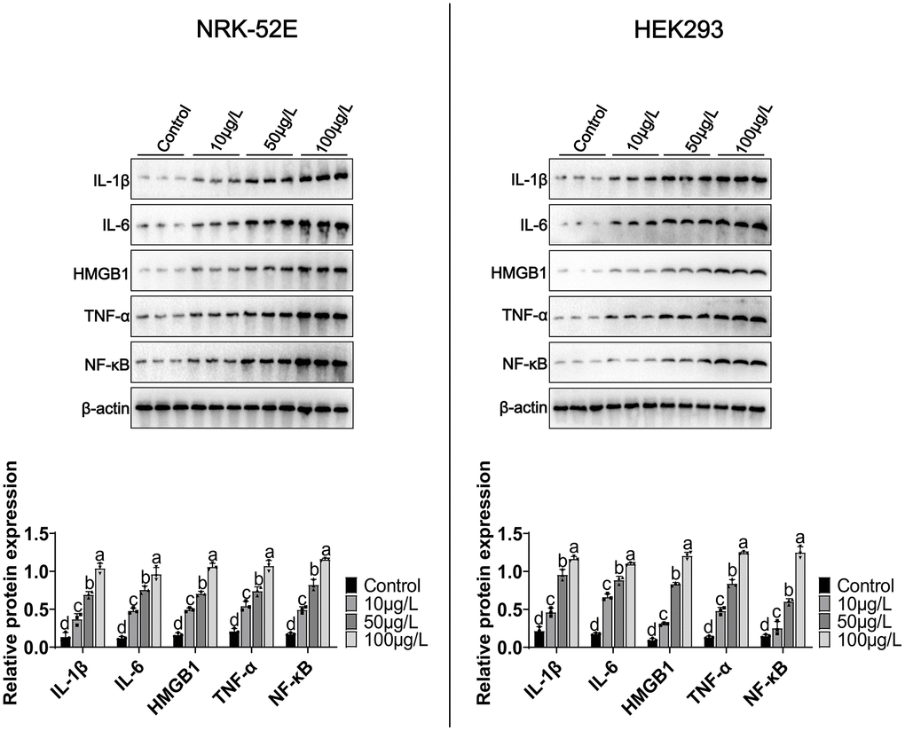 We treated NRK-52E/HEK293 with different concentrations of MCCPs (0 μg/L-100 μg/L) for 24 h. The experimental data demonstrated that MCCPs were able to significantly up-regulate the expression of inflammatory molecules, including IL-β, HMGB1, IL-6 and TNF-α expression (Figure 2). In addition, the expression of the inflammatory signaling molecule NF-κB was also significantly elevated compared to control group. These data suggest that MCCPs can induce inflammatory responses in NRK-52E and HEK293 cells (Figure 2).