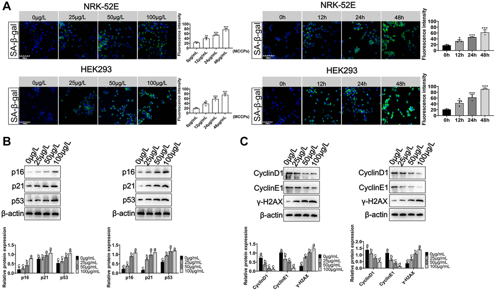 Here, we evaluated the effect of MCCPs on renal cell senescence. NRK-52E and HEK293 cells were treated with 0 μg/L, 25 μg/L, 50 μg/L and 100 μg/L MCCPs for 24 h. Sa-β-gal staining showed that MCCPs caused the senescence of kidney cells. Additionally, NRK-52E and HEK293 cells were treated with 50 μg/L MCCPs for 0 h, 12 h, 24 h and 48 h. SPiDER-βGal staining showed that MCCPs were able to induce cellular senescence in NRK-52E cell and HEK293 cells in a time-dependent manner (Figure 3A). The effects of MCCPs on senescence-associated molecular markers were evaluated, including p21, p53, p16, γ-H2AX, CyclinD1 and CyclinE1. The experimental data showed that MCCPs induced an increase in the expression of p16/p21/p53. MCCPs (50 μg/L) was used to treat NRK-52E and HEK293 cells for 0 h, 12 h, 24 h and 48 h. The experimental data showed that MCCPs increased the expression levels of senescence-associated proteins (p53, p16 and p21) in a time-dependent manner (Figure 3B). Furthermore, the expression of cell cycle proteins, such as CyclinD1 and CyclinE1, was down-regulated. The expression of γ-H2AX, a marker molecule for DNA damage, was up-regulated (Figure 3C).