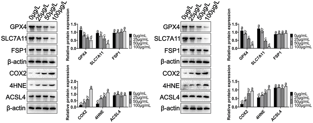 We analyzed the signaling pathways involved in MCCPs-induced ferroptosis in kidney cells. First, System Xc--glutathione-GPX4 expression was analyzed, and experimental data showed a significant downregulation of GPX4, and SLC7A11 (xCT) expression (Figure 5). Recent studies have shown that FSP1-CoQ10 is also involved in the process of ferroptosis, so we also evaluated the expression of FSP1, and the results showed that FSP1 expression was not significantly changed in our experimental system. COX2 and 4HNE are important molecules reflecting the degree of intracellular lipid peroxidation damage, the experimental data illustrated that the levels of COX2 and 4HNE were obviously elevated. However, the expression of ACSL4 (which is involved in fatty acid synthesis) did not show significant changes (Figure 5).