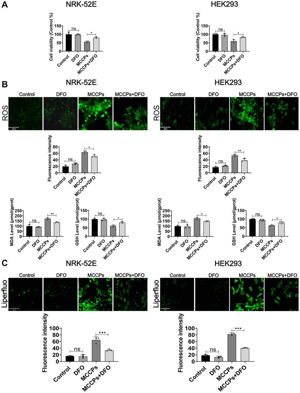 To further determine the type of cell death induced by MCCPs belongs to ferroptosis, ferroptosis inhibitor (desferrioxamine, DFO) was used to treat the cells. DFO is an inhibitor of ferroptosis by neutralizing excess intracellular Fe2+ ions. The optimal concentration of action of DFO that does not affect cell viability was tested. NRK-52E and HEK293 cells were treated with DFO (0 μΜ-100 μΜ) for 24 h. The cell proliferation assays performed in pre-experiment showed that 10 μΜ of DFO did not show significant damaging effects on renal cells, so we chose 10 μΜ DFO as the optimal concentration to be used in the subsequent experiments. To investigate the effect of DFO on MCCPs-induced NRK-52E and HEK293 cell damage, we pre-treated kidney cells with 10 μΜ DFO for 5 h and then continued to treat cell with MCCPs for 24 h. The experimental data showed that the DFO pretreatment could significantly improve the cell viability compared with the MCCP-treated group (Figure 6A). In addition, oxidative stress analyses showed that ROS, MDA levels were significantly down-regulated, but GSH levels were increased under DFO treatment (Figure 6B). Lipid peroxidation probe (Liperfluo) levels were significantly decreased under DFO treatment (Figure 6C).