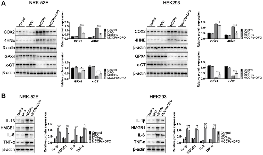 Further we investigated the effect of DFO on the expression of ferroptosis-related proteins. Western blot assays showed that x-CT and GPX4 expression was up-regulated under DFO treatment (compared with the MCCPs treatment group). However, COX2 and 4HNE expression was down-regulated (Figure 7A). Next, we analyzed the effect of MCCPs on the inflammation induced by MCCPs. The results showed that DFO alleviated the inflammatory response caused by MCCPs (Figure 7B).