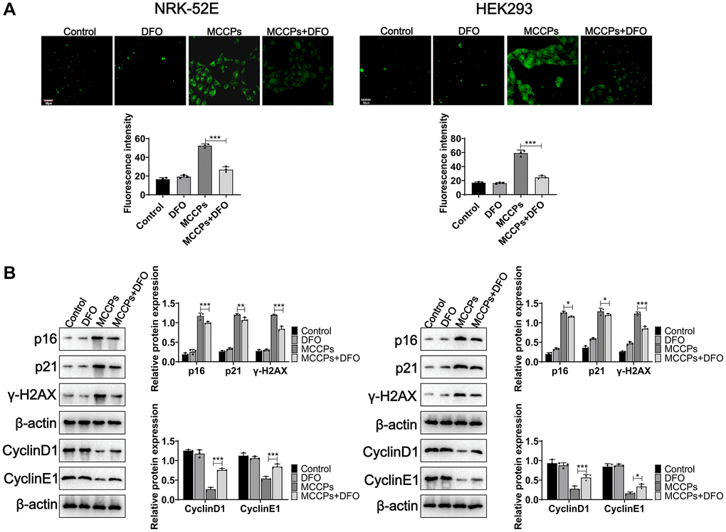 To determine whether MCCPs-induced ferroptosis in renal cells is the basis of cell senescence, DFO was used to treat NRK-52E and HEK293 cells, the experimental results showed that they alleviated premature aging of renal cells by Sa-β-gal staining (SPiDER-βGal) (Figure 8A). Further experiments showed that DFO significantly reduced p21, p16, γ-H2AX expression, and increased CyclinD1 and CyclinE1 expression (Figure 8B).