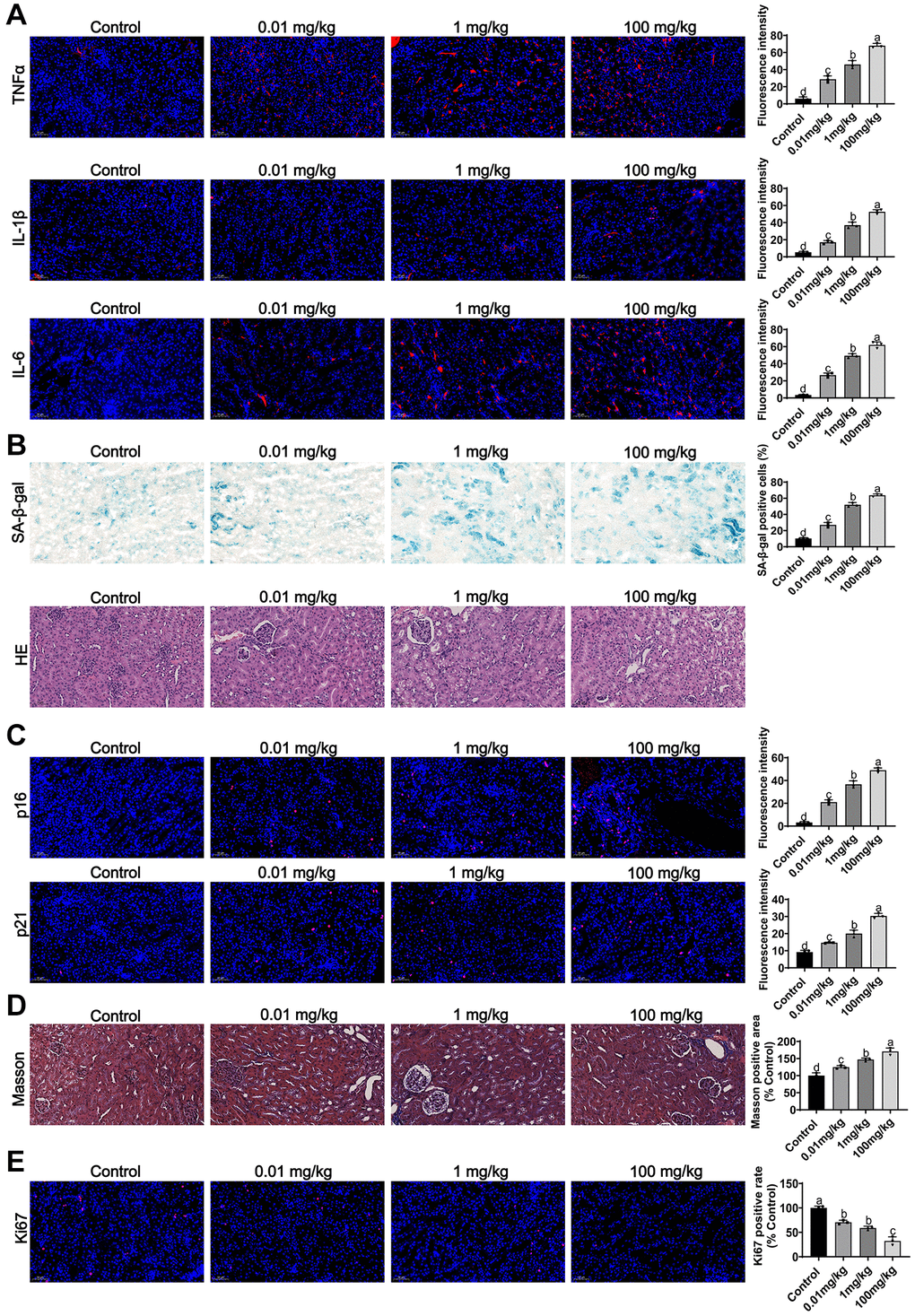 In vivo, we assessed the effect of MCCPs on renal inflammation and aging in vivo. The results of indirect immunofluorescence showed that MCCPs caused inflammatory responses (TNFα, IL-1β andIL-6) in the kidney (Figure 9A). Furthermore, we evaluated the effect of MCCPs on renal aging, and Sa-β-gal staining showed that MCCPs led to the renal aging. HE staining also indicated that renal tissue underwent damage (Figure 9B). Meanwhile, p21 and p16 staining also showed that MCCPs contributed to renal aging (Figure 9C). Furthermore, Masson staining showed that the level of kidney fibrosis was significantly increased compared to the control group (Figure 9D). Additionally, ki67 staining showed that the regenerative capacity of the kidney tissue was significantly reduced compared to the control group (Figure 9E). We also observed an elevation in iron ion levels in the MCCPs-treated group (Supplementary Figure 1).