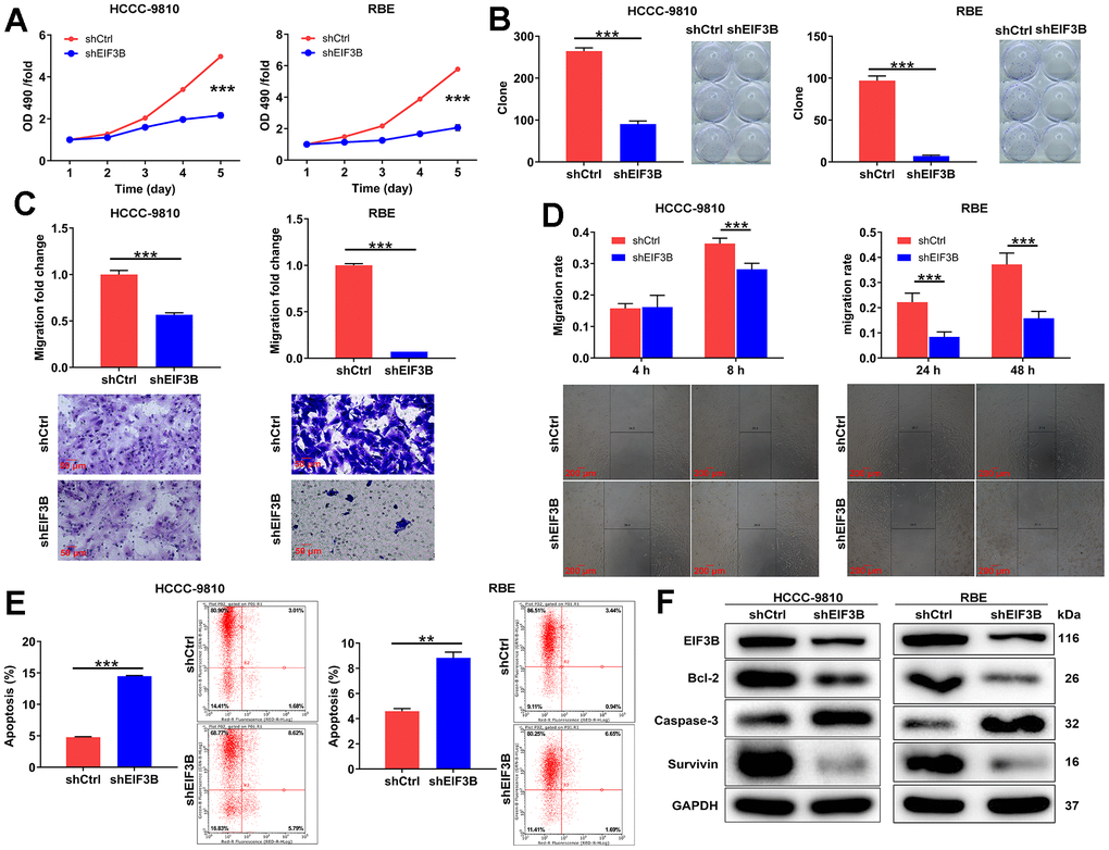 In this section, our aim was to elucidate the roles of EIF3B in cholangiocarcinoma development. Consequently, we knocked down EIF3B in HCCC-9810 and RBE cells, achieving transfection efficiencies exceeding 80%, and observed a substantial decrease in EIF3B mRNA and protein levels (Supplementary Figure 1). Subsequently, we assessed the impact of EIF3B depletion on cholangiocarcinoma cell phenotypes. As expected, the cells in shEIF3B groups exhibited a slower proliferation rate compared to the shCtrl groups (P < 0.001, Figure 2A). Additionally, Figure 2B illustrated that the capacity for colony formation was markedly suppressed upon knocking down EIF3B (P < 0.001). Furthermore, cell migration levels were evaluated through wound-healing assay and transwell assay, indicating that both shEIF3B-transfected cells exhibited lower migration levels than their corresponding shCtrl-transfected cells (P < 0.001, Figure 2C, 2D). More importantly, EIF3B depletion significantly enhanced cell apoptosis (P < 0.001 for HCCC-9810 cells, P < 0.01 for RBE cells, Figure 2E). Notably, the levels of apoptosis-related proteins, including Bcl-2, caspase-3, and Survivin, were assessed through western blot in HCCC-9810 and RBE cells with shCtrl and shEIF3B. As anticipated, the results demonstrated a downregulation of Bcl-2 and Survivin, along with an upregulation of caspase-3 upon EIF3B knockdown (Figure 2F), implying that EIF3B might be involved in cholangiocarcinoma cell apoptosis through regulating these proteins. Taken together, we concluded that EIF3B promoted cholangiocarcinoma cell growth and migration, while suppressing cell apoptosis in vitro.