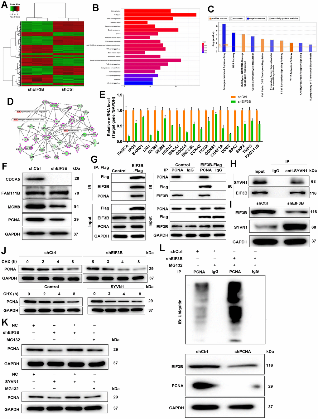 To investigate the mechanism behind EIF3B knockdown blocking cholangiocarcinoma progression, we conducted a PrimeView Human Gene Expression Array on shCtrl/shEIF3B-transfected HCCC-9810 cells, identifying 402 upregulated and 442 downregulated genes in the shEIF3B group (Figure 3A). Subsequent pathway enrichment analyses underscored the enrichment of the cell cycle pathway, specifically highlighting the NER Pathway, Estrogen-mediated S-phase Entry, and Cyclins and Cell Cycle Regulation (Figure 3B, 3C). The interaction network based on IPA revealed that EIF3B influenced BARD1, BRCA1, CCNA2, CCNB1, CDCA5, CHAF1A, DDB2, ERCC6L, FAM111B, FANCA, HSDL2, IPO5, LIG1, MCM8, MDM2, PCNA, RPA2, SKP2 and TMPO in these pathways (Figure 3D). To further validate our findings, we performed qPCR on these key genes, observing a consistent decrease in these genes in response to EIF3B depletion (Figure 3E). Additionally, a differential expression analysis of these genes based on cholangiocarcinoma and normal tissues samples from the TCGA database revealed significant upregulation of CDCA5, FAM111B, MCM8 and PCNA in cholangiocarcinoma, supporting their relevance in this context (Supplementary Figure 2). Subsequent western blot experiments corroborated a noticeable downregulation in CDCA5, MCM8, and PCNA in response to EIF3B depletion (Figure 3F). While CDCA5 appeared to be more prominently regulated by EIF3B, we selected PCNA as a downstream target due to its well-established role as cell cycle marker. Also, expression of PCNA is a universal feature in cholangiocarcinoma [30]. Here, we also found that PCNA was abundantly expressed in cholangiocarcinoma tissues and cells (Supplementary Figure 3A, 3B). More importantly, there was a protein interaction between EIF3B and PCNA (Figure 3G). Next, we aimed to explore how EIF3B regulates PCNA expression. Through analyzing the ubibrowser website (http://ubibrowser.ncpsb.org.cn/ubibrowser/strict/networkview/networkview/name/P12004/jobId/ubibrowse-I2021-12-01-21544-1638350113), we identified SYVN1 as an E3 ubiquitin ligase of PCNA. Co-IP experiment indicated that SYVN1 could endogenously interact with EIF3B (Figure 3H). Additionally, the depletion of EIF3B resulted in a notable upregulation of SYVN1 protein levels in HCCC-9810 cells (Figure 3I).