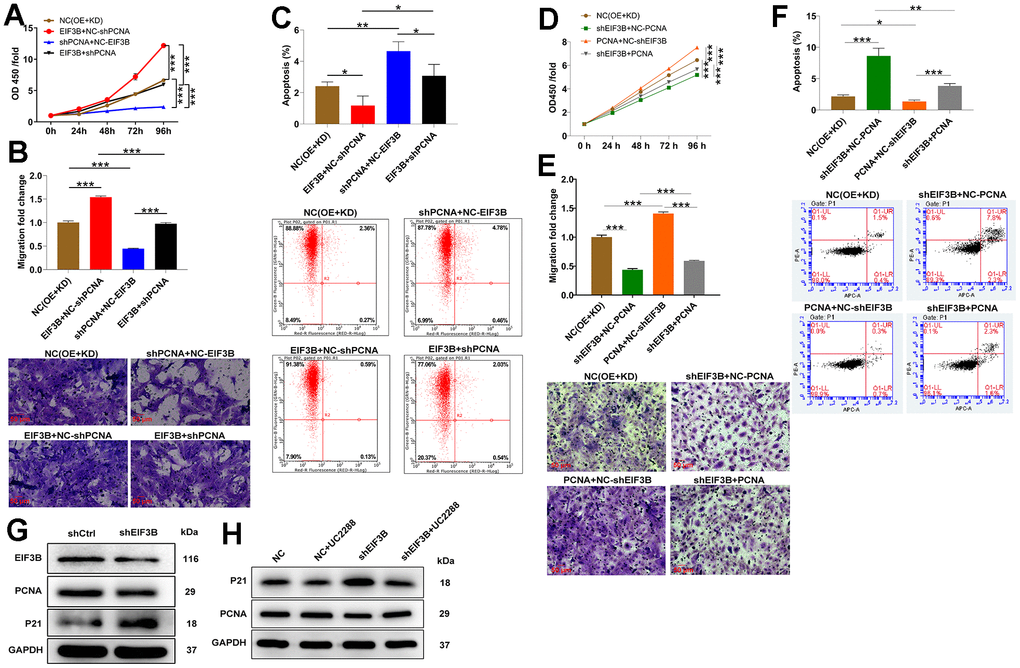 To confirm the contribution of PCNA to EIF3B-mediated cholangiocarcinoma progression, we established RBE cell models involving singular overexpression of EIF3B, singular silence of PCNA, and concurrent EIF3B overexpression with PCNA silencing. Transfection efficiency was assessed through qRT-PCR and western blot (Supplementary Figure 3D, 3E). Utilizing the Celigo cell counting assay, we observed that HCCC-9810 cells in the in EIF3B+NC-shPCNA group exhibited accelerated proliferation (P < 0.001), while those in the shPCNA+NC-EIF3B group displayed the opposite trend (P < 0.001). Importantly, the enhanced cell proliferation induced by EIF3B overexpression was mitigated upon PCNA knockdown (P < 0.01, Figure 4A). Moreover, EIF3B overexpression not only stimulated cell proliferation but also induced cell migration, and both effects were reversed by silencing PCNA (Figure 4B). Regarding apoptosis, there was a noticeable trend towards decreased cell apoptosis after EIF3B overexpression (P < 0.01), which was counteracted by PCNA knockdown (P < 0.001, Figure 4C). To further validate whether PCNA could reverse the inhibitory effects of EIF3B knockdown on cholangiocarcinoma, we conducted separate transfections of a PCNA overexpression plasmid and an EIF3B knockdown plasmid, as well as simultaneous transfections, in REB cells. Transfection efficiency was assessed through qRT-PCR and western blot (Supplementary Figure 3D, 3E). Remarkably, PCNA overexpression effectively rescued the tumor-inhibitory effects induced by EIF3B knockdown, resulting in heightened proliferation and migration, alongside the inhibition of apoptosis (Figure 4D–4F). Overall, our findings demonstrated that EIF3B was involved in cholangiocarcinoma development through targeting PCNA.