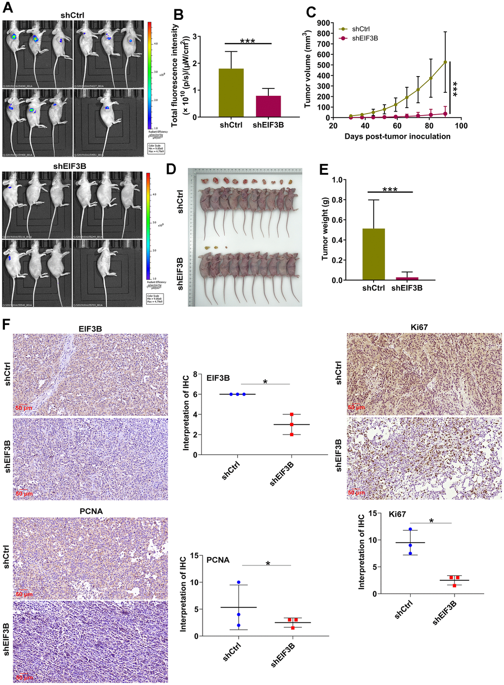 To ascertain the crucial role of EIF3B in cholangiocarcinoma tumor growth, animal models were established by implanting EIF3B-knockdown RBE cells into female BALB/c nude mice (Figure 5A). The results revealed that the shEIF3B group exhibited significantly lower fluorescence intensity, smaller tumor size, as well as reduced weight and volume compared to the shCtrl group (Figure 5B–5E). After 90 days, tumor tissues were harvested for IHC analysis, demonstrating a marked downregulation of EIF3B, PCNA and Ki-67 levels in the EIF3B knockdown group (Figure 5F). These indicated that EIF3B is essential not only for cell proliferation and migration in vitro but also for efficient tumor growth in vivo.