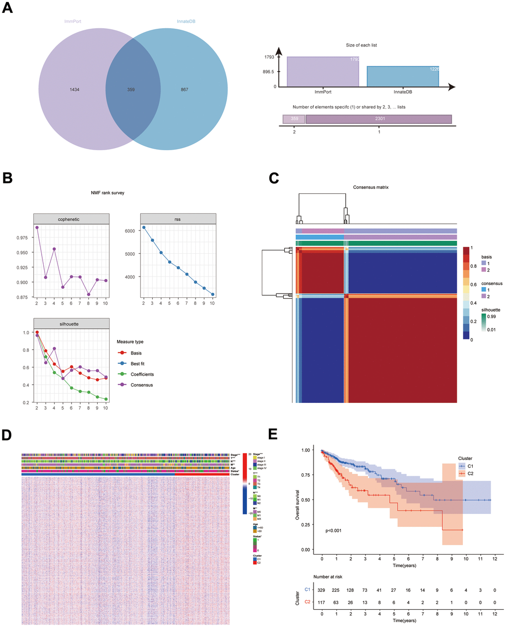 We retrieved the expression data of IRGs from UCSC Xena database, which consisted of 471 samples from COAD patients. NMF analysis was performed on the screened data utilizing the ‘brunet’ criterion with the “NMF” package in R [29]. The ideal number of clusters was produced based on the results of the consensus clustering graph and residual sum of squares (rss), dispersion, and cophenetic graphs.