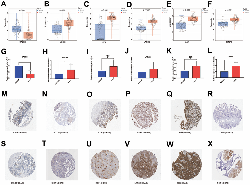 The Human Protein Atlas database (https://www.proteinatlas.org/) was used to retrieve the expression of the 6 genes at the protein level in healthy colon tissues and colon cancer tissues, and the results were consistent with RT-qPCR (Figure 11M–11X).