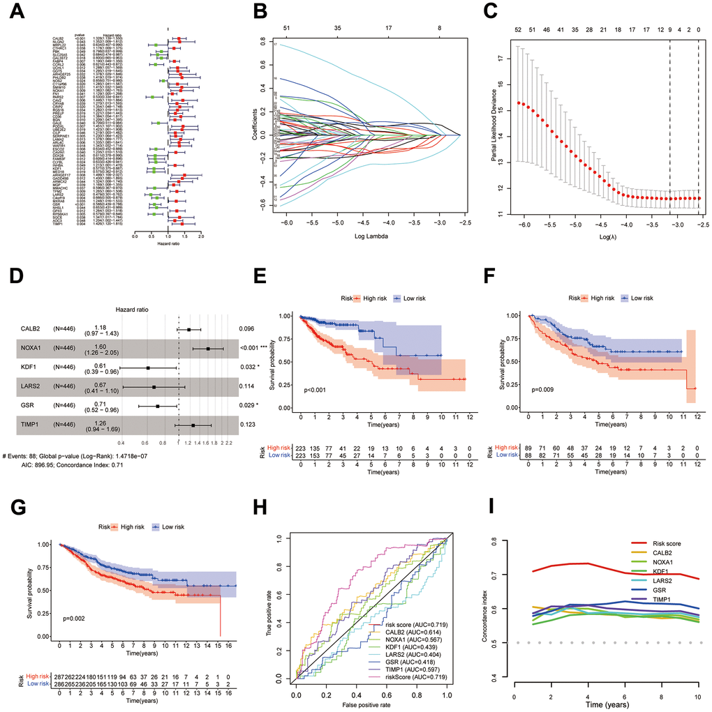 58 DEIGRC associated with prognosis in COAD patients were obtained by univariate Cox regression analysis (Figure 4A, p<0.05). LASSO and multi-factor Cox regression analyses were performed sequentially on the 58 DEIGRC, resulting in the construction of the DPM consisting of 6 genes (Figure 4B–4D). CALB2, NOXA1, and TIMP1 were positively related to great poor prognosis, whereas KDF1, LARS2, and GSR were positively related to excellent prognosis (Supplementary Figure 3A–3F). In the COAD patients from UCSC Xena database, GSE17536 and GSE39582 datasets, the DEIGRC model displayed a strong ability to predict prognosis (Figure 4E–4G). The DEIGRC model had a greater prediction performance than the genes used to build it, according to the ROC curve and the C-index (Figure 4H, 4I).