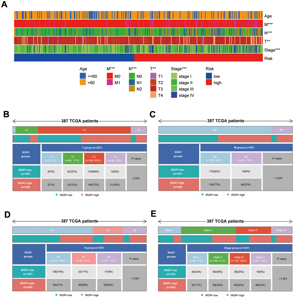 After collecting and filtering the clinical information of COAD patients from the UCSC Xena database, heat maps were created to show the clinical traits of the subgroups. The distribution of T, M, N, and Stage between subgroups was substantially different (Figure 6A, p<0.01). Using the “ComplexHeatmap” package in R, it is possible to more clearly demonstrate the distribution of T, M, N, and Stage between subgroups (Figure 6B–6E).
