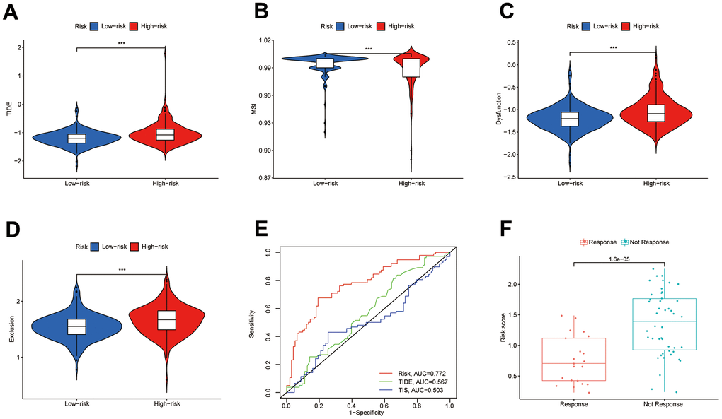 Low-risk subgroup had larger microsatellite instability (MSI) scores, while the high-risk subgroup had larger TIDE, T-cell rejection, and T-cell dysfunction scores (Figure 9A–9D). We, therefore, considered that the DEIGRC model may be used to forecast which patients might benefit from immunotherapy. ROC curve results showed DPM had higher predictive efficacy than the TIDE and TIS models (Figure 9E). Patients who responded to sorafenib had lower risk scores than those who did not, so the DEIGRC model might be able to be used to predict the effectiveness of sorafenib treatment (Figure 9F).