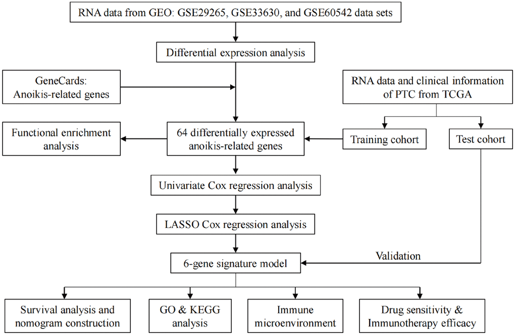 In this study, we conducted an analysis of differentially expressed genes (DEGs) between PTC and adjacent normal tissues using publicly available databases. By integrating this data with clinical information, we developed a six-gene signature related to anoikis to predict the prognosis of PTC patients and elucidate immune cell infiltration patterns. This approach aims to enhance treatment options and improve patient outcomes in PTC.