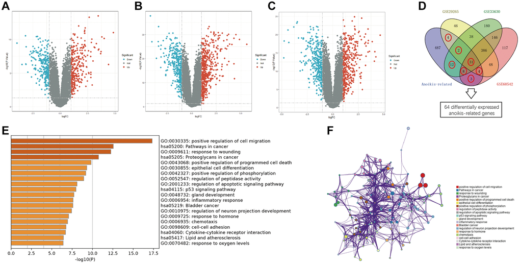 The data of PTC was obtained from three GEO cohorts and TCGA database, and the details are shown in Table 1. By comparing tumor tissues and adjacent non-neoplastic tissues, 561 DEGs were obtained from GEO: GSE29265, with 288 genes showing upregulation and 273 showing downregulation in tumor tissues (Figure 2A). 806 DEGs were obtained from GEO: GSE33630, with 459 genes showing upregulation and 347 showing downregulation in tumor tissues (Figure 2B). 745 DEGs were obtained from GEO: GSE60542, with 381 genes showing upregulation and 364 showing downregulation in tumor tissues (Figure 2C). The DEGs obtained from the GEO datasets were intersected with the 551 anoikis-related genes to obtain ADGs. 64 ADGs overlapped between the four datasets (Figure 2D). The modulation-specific biological processes and pathways features of the 64 ADGs were then analyzed. Results were visualized by bar graphs and PPI networks. The GO and KEGG analyses showed that enrichments were mainly focused on positive regulation of cell migration, pathways in cancer, response to wounding, proteoglycans in cancer, and positive regulation of programmed cell death et al. (Figure 2E, 2F).