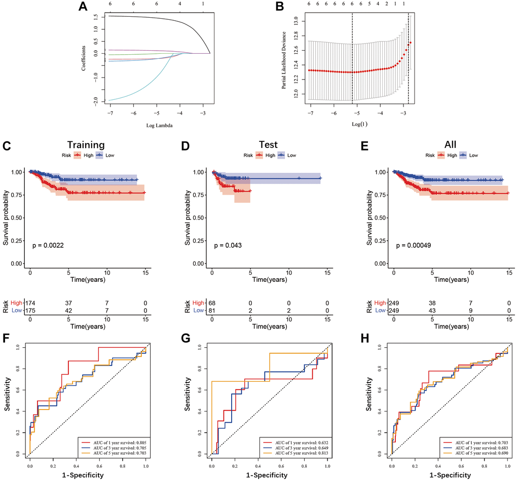 To establish a prognostic model for ADGs in PTC patients from TCGA database, a univariate Cox analysis of progression-free interval (PFI) was first conducted using the R packages “survival” and “survminer” to identify the survival-related genes among the ADGs with a prognosis value (P < 0.05). These survival-related genes were then included in the subsequent Least Absolute Shrinkage and Selection Operator (LASSO) Cox regression analysis by using “glmnet” R package. The 10-fold cross validation and 1,000 iterations were performed to minimize the potential risk of overfitting and select optimal prognostic genes. The prognostic genes signature was calculated based on the normalized gene expression level and corresponding regression coefficients. The risk score for prognosis was determined by using a linear combination of the regression coefficient in the LASSO regression and the gene’s expression level.