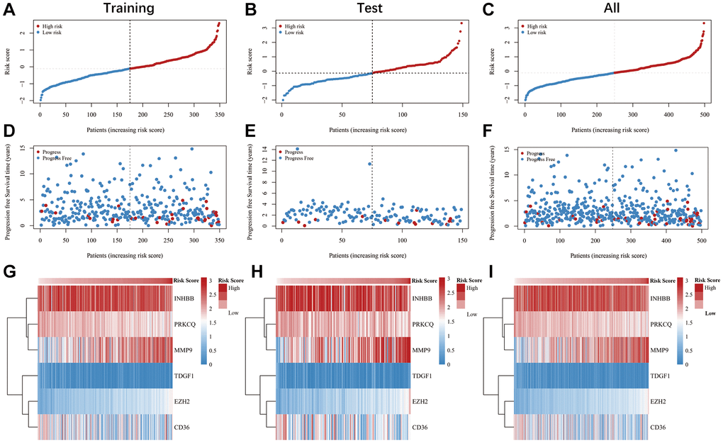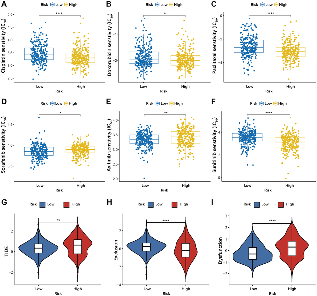 Using the R package “pRRophetic”, we investigated the IC50 values of six common chemotherapeutic and targeted drugs (Cisplatin, Doxorubicin, Paclitaxel, Sorafenib, Axitinib, and Sunitinib) in both the high- and low-risk groups of PTC patients. PTC patients in the low-risk group demonstrated greater sensitivity to Sorafenib and Axitinib. Conversely, PTC patients in the high-risk group exhibited increased sensitivity to Cisplatin, Doxorubicin, Paclitaxel, and Sunitinib (Figure 9A–9F). To evaluate the risk model’s value in immunotherapy, we compared the TIDE and other immune-related scores between high- and low-risk groups. The high-risk group showed higher TIDE score and Dysfunction score, and lower Exclusion score (Figure 9G–9I), indicating a limited immunotherapy benefit for PTC patients in the high-risk group.