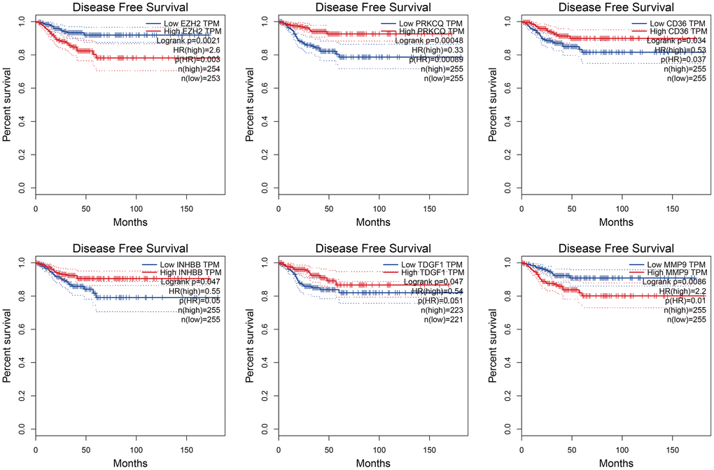 We employed K-M and ROC curves to evaluate the prognostic significance of the anoikis-related prognostic signature across training, test, and overall cohorts. The K-M analysis showed that patients with high-risk scores had significantly worse progression-free survival (FPS) rates compared to patients with low-risk score in both the training (P = 0.0022), test (P = 0.043), and overall (P = 0.00049) cohorts (Figure 3C–3E). The AUC values for 1-, 3-, and 5-year FPS rates obtained from the prognostic signature in the training cohort were 0.805, 0.705, and 0.703, respectively (Figure 3F), while those in the test cohort were 0.632, 0.649, and 0.813, respectively (Figure 3G), and in the overall cohort were 0.703, 0.683, and 0.69, respectively (Figure 3H). The distribution of the risk score is shown in Figure 4. The progression rate of PTC patients increases proportionally with their risk scores (Figure 4A, 4D). Furthermore, this pattern remains consistent across both the test (Figure 4B, 4E) and overall (Figure 4C, 4F) cohorts. Significantly, patients with high-risk scores exhibited elevated expression levels of EZH2 and MMP9, while PRKCQ, CD36, INHBB, and TDGF1 demonstrated decreased expression levels across all three cohorts (Figure 4G–4I). Utilizing the GEPIA database, we conducted survival analysis on the six genes featured in the prognostic signature. Our findings revealed that PRKCQ, CD36, INHBB, and TDGF1 were correlated with better prognosis and disease-free survival (DFS) in THCA patients, whereas EZH2 and MMP9 were linked to an unfavorable prognosis and reduced DFS among individuals with THCA (Figure 5).