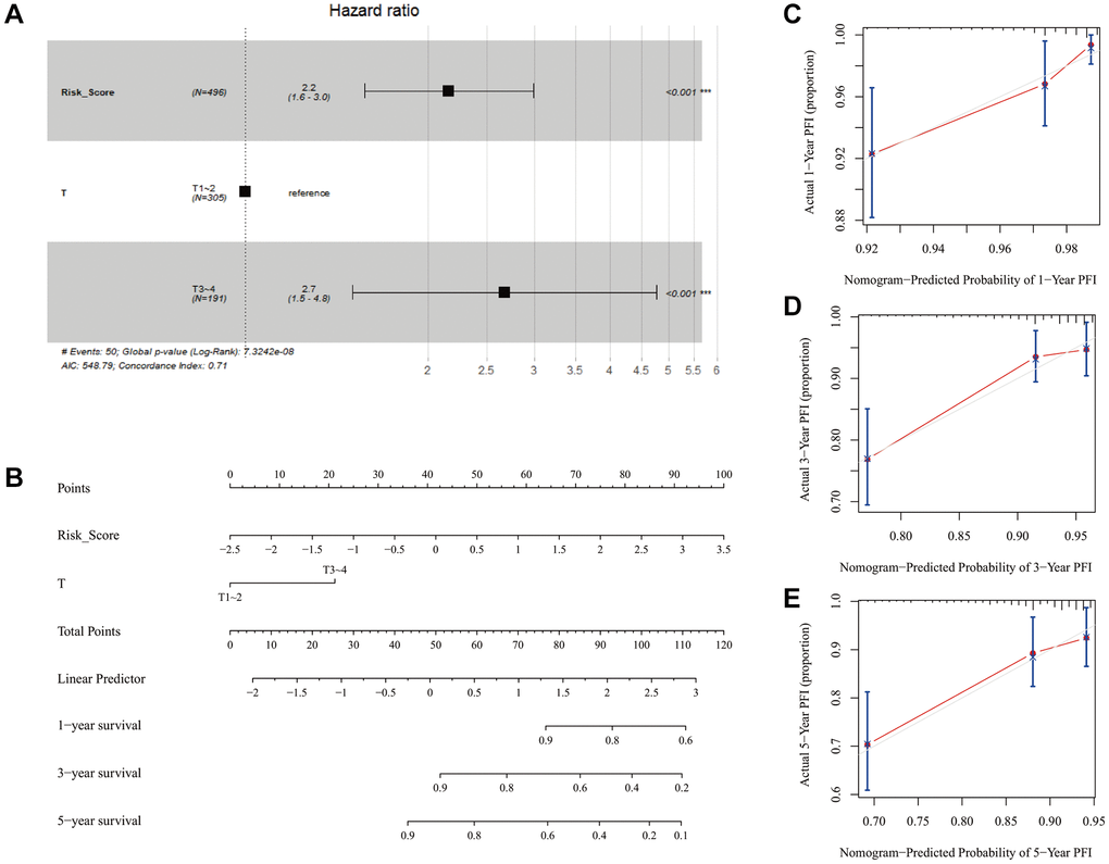 The univariate and multivariate Cox regression analyses showed that the risk score and T stage were the independent significant prognostic factors in predicting PFS in patients with PTC (Supplementary Table 2 and Figure 6A). We subsequently constructed a predictive nomogram with these factors (Figure 6B). Besides, the C-index calculated by R for the nomogram was 0.712, suggesting that the nomogram had a superior predictive performance. The calibration curves were used to evaluate the accuracy of the nomogram, in which a standard curve represented the best prediction. The predicted outcomes of 1-, 3- and 5-year progress-free survival rates showed excellent consistency (Figure 6C–6E).