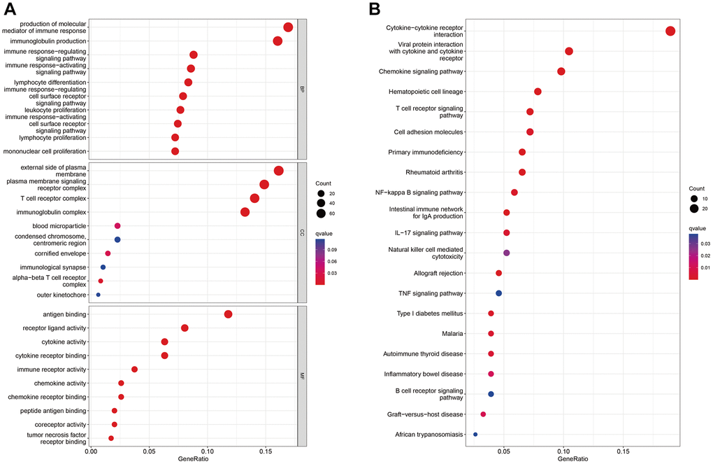 567 DEGs were obtained between high- and low-risk groups (Supplementary Figure 1). In order to gain a deeper comprehension of the potential biological mechanisms underlying the DEGs associated with high- and low-risk patients, we performed an analysis utilizing the GO and KEGG databases. The investigation revealed that the biological processes primarily encompassed the production of molecular mediator of immune response, immunoglobulin production, and immune response-regulating and activating cell surface receptor signaling pathway. Additionally, the molecular functions were found to be associated with antigen binding, receptor ligand activity, cytokine activity, and cytokine receptor binding. The cellular components analyzed in this study encompassed the external side of plasma membrane, plasma membrane signaling receptor complex, T cell receptor complex, and immunoglobulin complex. (Figure 7A, Supplementary Table 3). Through KEGG analysis, it was determined that these DEGs were primarily associated with cytokine-cytokine receptor interaction, viral protein interaction with cytokine and cytokine receptor, chemokine signaling pathway, and hematopoietic cell lineage (Figure 7B, Supplementary Table 4).