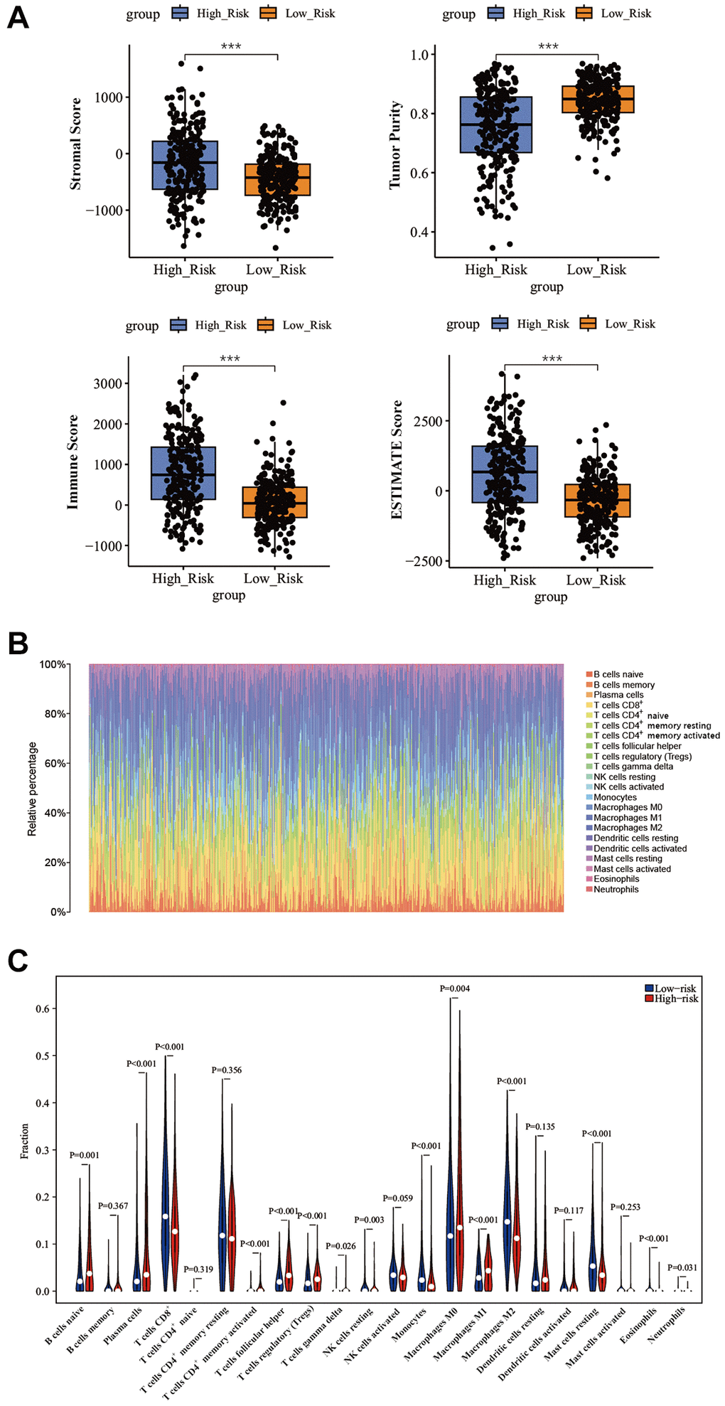 The ESTIMATE algorithm was used to calculate the stromal score, immune score, and tumor purity between high-risk and low-risk groups [21]. The CIBERSORT algorithm was used to estimate the abundance of 22 immune cell types. The infiltration levels of 22 immune cell types between the high-risk and low-risk subgroups were compared [22].