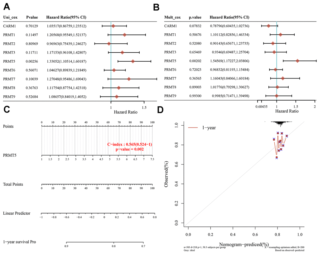 In order to analyze the effect of PRMT on the prognosis of HNSC, we first found by univariate and multivariate regression analysis that only PRMT5 was statistically significant in both methods of analysis (Figure 2A, 2B). Based on the results of a multivariate Cox proportional risk analysis, a column chart was constructed using the “rms” package to predict the overall 1-year recurrence rate. PRMT5 was found to be a risk factor affecting the prognostic risk of patients. PRMT5 was found to be a risk factor influencing patient prognosis (Figure 2C, 2D). These findings suggest that PRMT5 can predict patient survival in HNSC and that high PRMT5 expression is associated with poor prognosis in HNSC.
