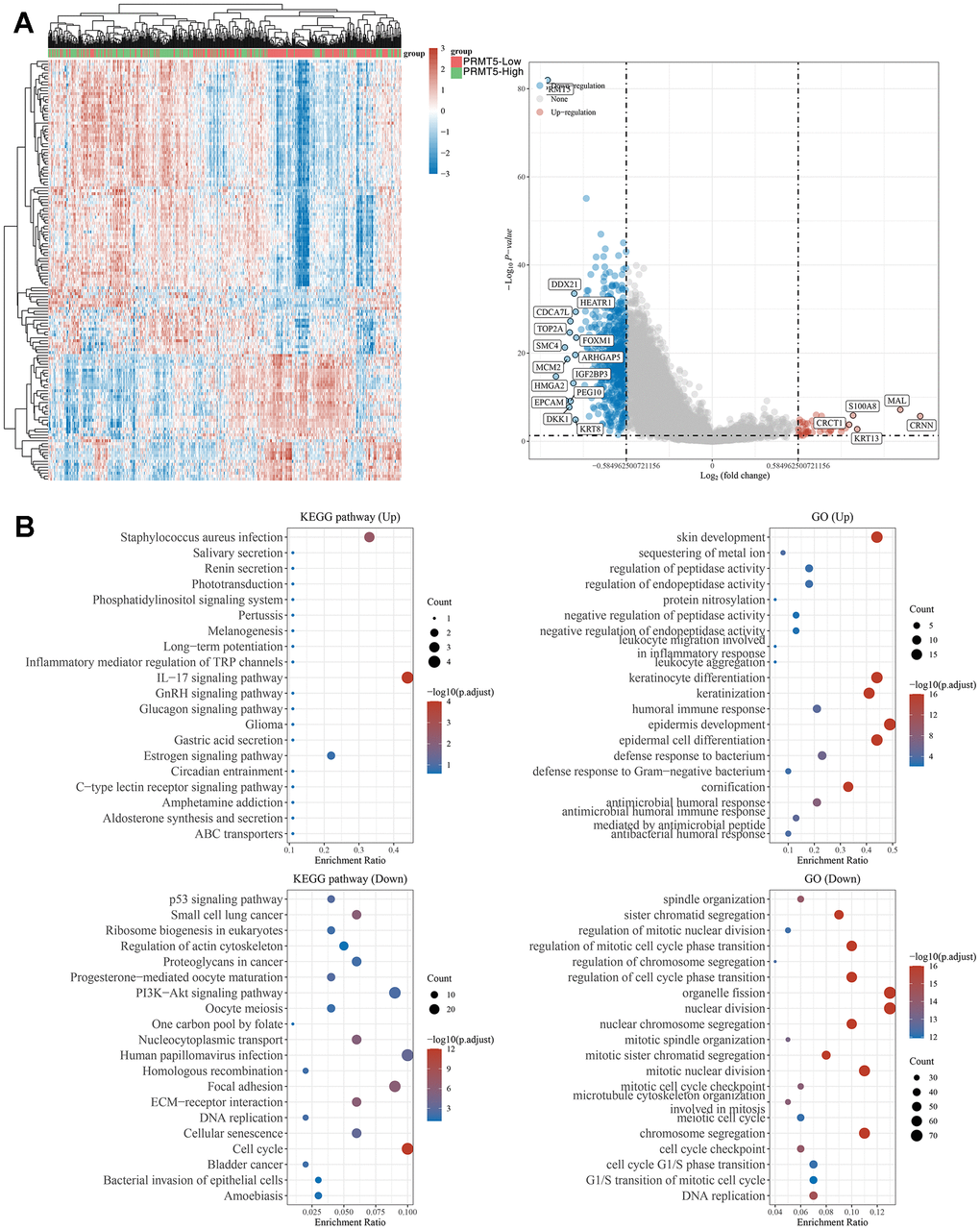 To explore the mechanisms by which PRMT5 may regulate the development of head and neck tumor, we first analysed differential gene expression in samples with differential PRMT5 expression using TCGA HNSC samples, and in total we identified a large number of PRMT5-regulated genes, including DDX21, S100A8, SMC4 (Figure 3A). We further performed KEGG and GO analysis on the differential genes regulated by PRMT5 and found that these gene-enriched pathways are closely related to tumor development, such as IL-17, P53, PI3K-AKT and other signaling pathways (Figure 3B). These results suggest that PRMT5 may promote the progression of HNSC by activating tumor-associated signaling pathways.