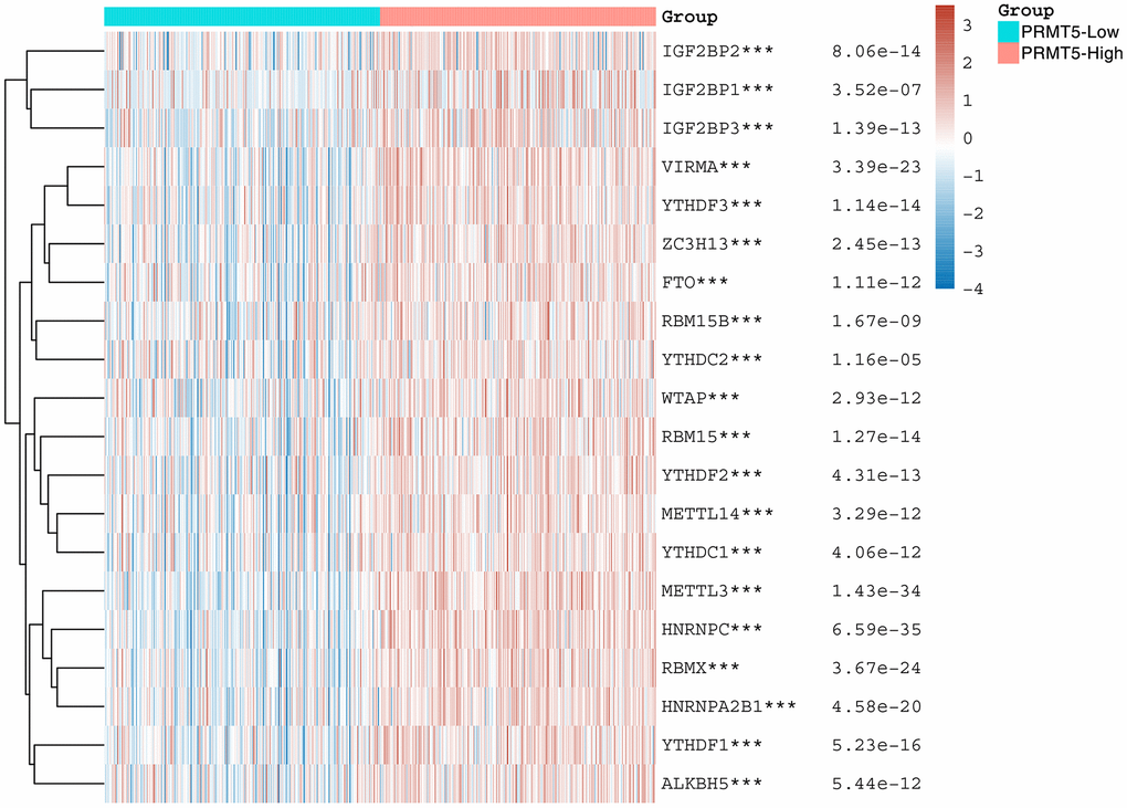 It has been found that the pattern and level of m6A modification in tumors are usually different from that in normal tissues. aberrant expression or disorders of m6A modification have been associated with a wide range of tumors, including lung, breast, bladder, gastric, liver, and colorectal cancers. This suggests that m6A modification may have an important regulatory role in tumorigenesis and development [24, 25]. m6A modifications can regulate tumor biological processes in several ways. First, m6A modifications can affect the proliferation, invasion and metastatic ability of tumor cells. Second, m6A modifications can regulate the stem cell properties and drug resistance of tumor cells [26, 27]. In addition, m6A modifications can affect the immune escape of tumors and the formation of the tumor microenvironment. The m6A modifications are mainly regulated by three core enzymes (“Writer”) and various “Readers” and “Erasers”. The “Writers” include methyltransferases such as METTL3, METTL14 and WTAP, which are responsible for adding m6A modifications to RNA molecules. The “Readers” include m6A recognition proteins such as YTHDF1, YTHDF2, YTHDF3, YTHDC1, and HNRNPA2B1, which are able to recognize and bind RNAs with m6A modifications. The “Eraser” includes two proteins: ALKBH5 and FTO, whose main role is to remove the m6A modification [28]. In our study, we found a significant positive correlation between PRMT5 and the expression of m6A-related genes, suggesting that in HNSC PRMT5 may influence the development of HNSC by regulating the expression of m6A-related genes. Despite the initial understanding of the role of m6A modification in tumors, there are still many unknowns. For example, the specific mechanisms of m6A modification, regulatory networks and interactions with other regulatory factors still require further research. Further studies will help to reveal the mechanism of the role of m6A modification in tumorigenesis and development and provide a theoretical basis for the development of new therapeutic strategies.