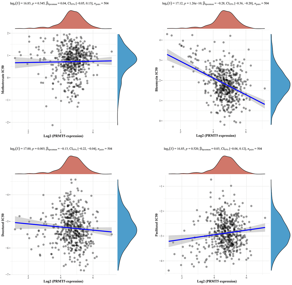 Tumor immunotherapy is an emerging approach to tumor treatment that utilizes the patient’s own immune system to identify, attack and remove tumor cells. The goal of immunotherapy is to increase the body’s immune response to tumors in order to achieve long-term control or even elimination of tumors [19]. To investigate the relationship between PRMT5 expression and immune cell infiltration in HNSC, we found that PRMT5 expression showed a significant positive correlation with NK cells as well as CD4-positive T-cell infiltration by TIMER algorithm using TCGA data (Figure 4A–4C). We also further analyzed the correlation between PRMT5 expression and common immune checkpoints in HNSC, including, SIGLEC15, TIGIT, CD274, HAVCR2, PDCD1, CTLA4, LAG3 and PDCD1LG2 etc. We found no significant correlation between PRMT5 expression and the expression of common immune checkpoints (Figure 4D). These results suggest that PRMT5 may affect the efficacy of immunotherapy mainly by influencing the infiltration of immune cells, but not by influencing the expression of immune checkpoints.