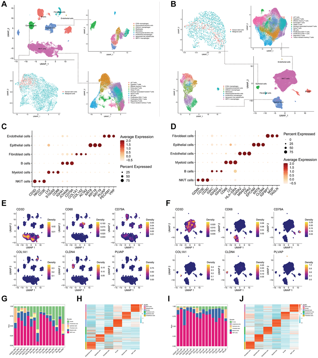 In this study, we performed cell annotation to categorize the main cell types found in pCRC (Figure 1A) and LM (Figure 1B) into six distinct groups, which include B cells, endothelial cells, fibroblast cells, epithelial cells, myeloid cells, and NK/T cells. Notably, our analysis of UMAP dimensionality reduction clustering plots for pCRC and LM demonstrated the clear demarcation of these six main cell types. However, it is of particular interest that within pCRC’s Myeloid cell population, two outlier clusters emerged, with one cluster closely associated with B cells. Upon further subtype annotation, these two clusters were identified as Mastocytes and plasma cell-like dendritic cells (Figure 1A). In contrast, the corresponding LM exhibited only one outlier cluster identified as plasma cell-like dendritic cells, with the Mastocytes subtype absent (Figure 1B). Subsequently, we characterized marker features for the main cell types present in pCRC and LM. The marker features for pCRC (Figure 1C) encompass B cells (IGHA1, JCHAIN, CD79A), endothelial cells (PLVAP, PECAM1, VWF), fibroblast cells (COL1A1, COL1A2, ACTA2), epithelial cells (KRT8, KRT18, KRT19), myeloid cells (LYZ, S100A9, CD68), and NK/T cells (CD3D, NKG7, CD3E), aligning with prevailing literature. It is worth mentioning that LM’s marker features exhibit slight divergence from those in pCRC (Figure 1D), especially in the case of endothelial cells (GATA2, MS4A2, CPA3) and fibroblast cells (IGFBP7, MGP, TAGLN), indicating a noteworthy distinction in the stromal cell composition between LM and pCRC. Furthermore, we depicted the expression patterns of primary cell type markers using density maps generated via UMAP dimensionality reduction (Figure 1E, 1F). Cell proportion plots (Figure 1G, 1I) reveal a higher proportion of epithelial cells and B cells in pCRC as compared to LM, while LM exhibits a significantly elevated proportion of NK/T cells. Detailed expression profiles of the top 50 DEGs for the six main cell types are presented in Figure 1H, 1J.