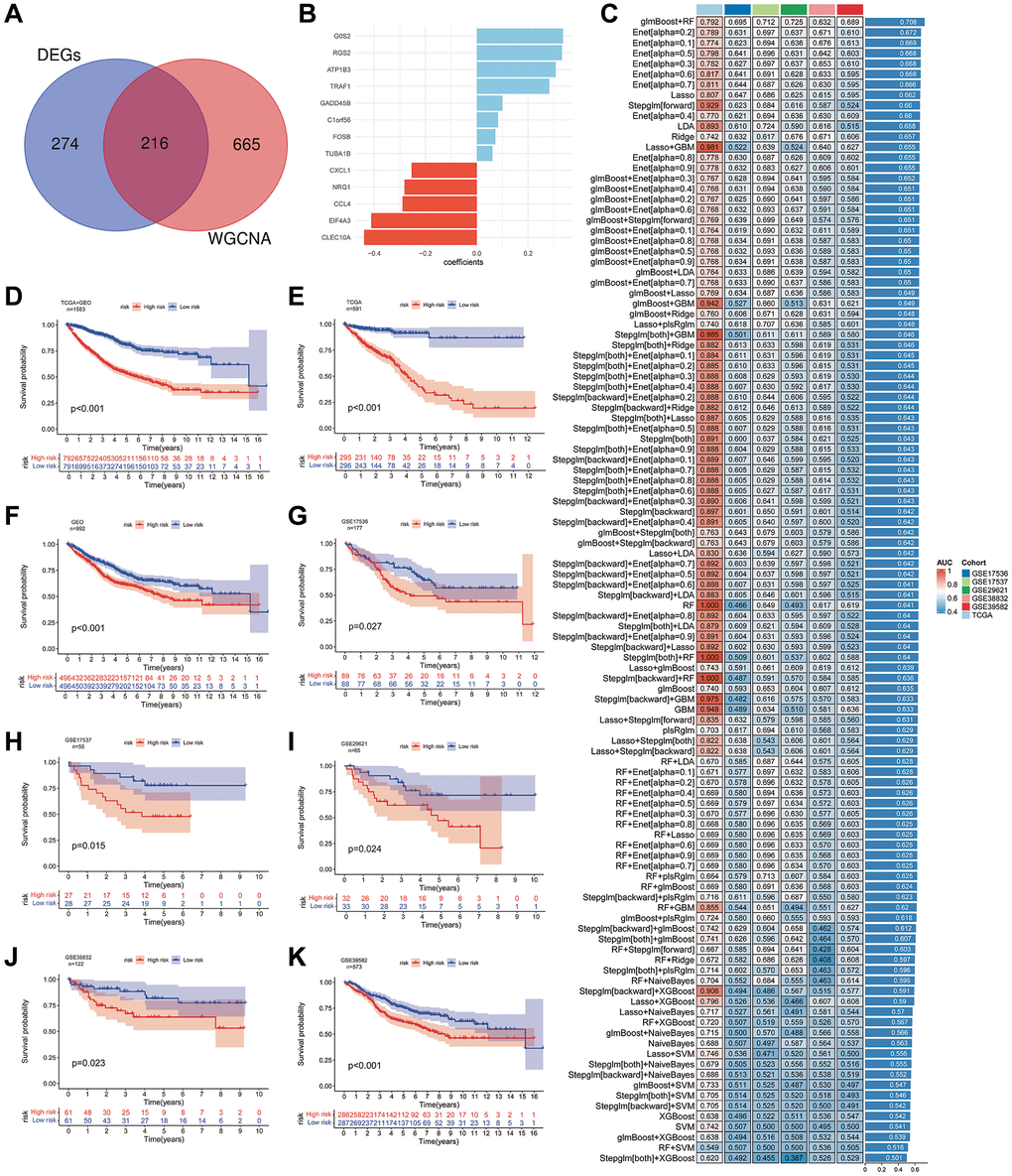 To construct a prognostic risk model, we employed 12 machine learning algorithms for model development and validation through a combination of 113 models. Initially, we selected 216 SRGs by taking the intersection of 490 DEGs and 881 MEs in the turquoise module (Figure 10A). After constructing and validating machine learning models, we determined that a prognostic risk model combining the glmBoost and RandomForest algorithms yielded the best results (Figure 10B). The model consisted of 13 genes (G0S2, RGS2, ATP1B3, TRAF1, GADD45B, C1orf56, FOSB, TUBA1B, CXCL1, NRG1, CCL4, EIF4A3, CLEC10A). Evaluating the AUC of the training and validation datasets, we found that the prognostic risk model exhibited robust predictive capability for CRC’s OS (Figure 10C). Subsequently, we computed risk values for all samples and classified samples into high- and low-risk groups using the median risk value. Kaplan-Meier survival curves portrayed the OS of these groups. Across all samples (Figure 10D), the training dataset (Figure 10E), and the validation dataset (Figure 10F), we consistently observed that the low-risk group had a significantly higher OS compared to the high-risk group. Furthermore, the Kaplan-Meier survival curves for the five validation subsets (Figure 10G–10K) reaffirmed this conclusion.
