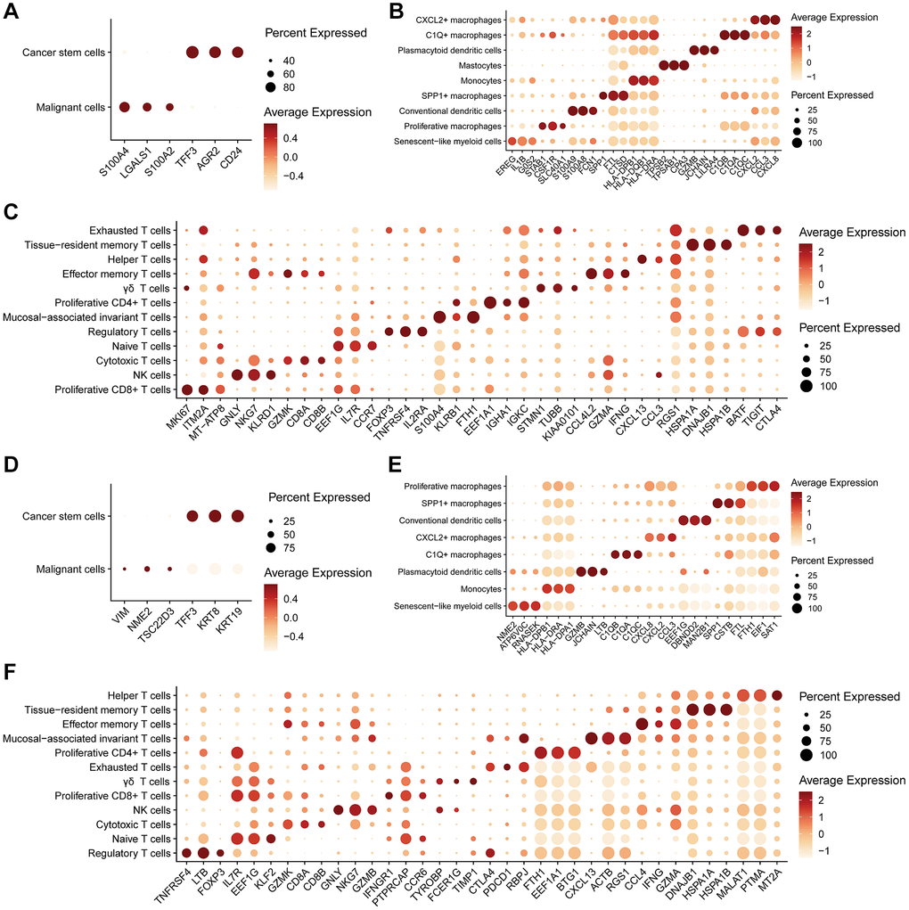 Through differential expression analysis, we identified distinctive markers for all cell subtypes within the three main cell types mentioned above (Figure 2A–2F). Our results underscore substantial heterogeneity between malignant tumor cells in pCRC and LM tissues. Notably, the markers for conventional tumor cells and CSCs exhibited notable differences, particularly with LM tissue displaying a more pronounced stem-like profile (Figure 2A, 2D). In myeloid cells, pCRC exhibited SMC markers, including EREG, IL1B, and G0S2 (Figure 2B), whereas LM displayed NME2, ATP6V0C, and RNASEK as markers (Figure 2E). Both sets of markers exhibited high expression of senescence-related genes, albeit with distinctive expression patterns. Furthermore, various cell subtypes in myeloid cells, such as CXCL2+ macrophages, C1Q+ macrophages, and SPP1+ macrophages, featured highly characteristic markers (Figure 2B, 2E), consistent across both pCRC and LM. However, it is essential to note that all Myeloid cell subtypes partially expressed genes from the HLA gene family, posing challenges in distinguishing specific monocyte subtypes, especially those expressing HLA-DPB1 and HLA-DRA. Within NK/T cells, TEXs were found in close proximity to regulatory T cells (Tregs), displaying elevated expression of immune inhibitory receptors. The markers for TEXs in pCRC (Figure 2C) and LM (Figure 2F) exhibited similar characteristics, marked by heightened expression of CTLA4, BATF, TIGIT, PDCD1, and other genes, all representing typical markers of T cell exhaustion.