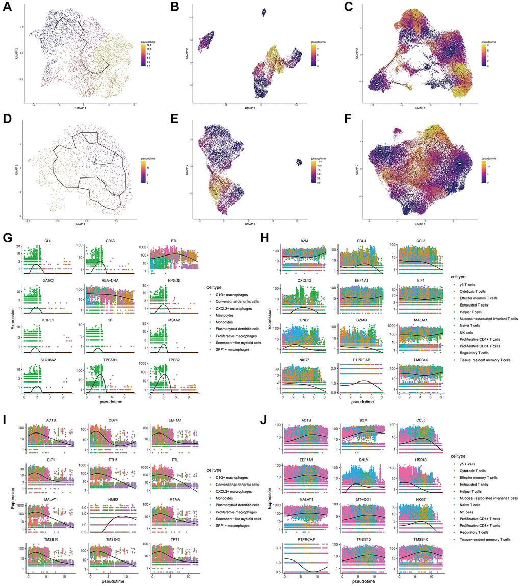 For each main cell type, the steps of dimensionality reduction clustering and differential gene expression analysis were repeated, and manual annotation was performed based on the expression characteristics of DEGs combined with the results of cell trajectory analysis to identify senescent and exhausted immune cells, annotating epithelial cells, myeloid cells, and NK/T cells into different cell subtypes.