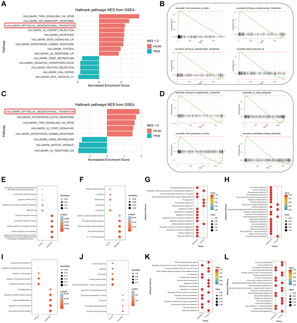 Based on the tissue of origin, we conducted comprehensive enrichment analyses encompassing biological functions, signaling pathways, and metabolic pathways for SMCs and TEXs subtypes. We prioritized GSEA analysis to explore whether SMCs and TEXs are associated with LM and to speculate on their pivotal mechanistic roles in promoting LM. The GSEA results for SMCs (Figure 4A) indicate significant enrichment in hallmark signaling pathways, including TNF-α signaling via NF-κB, EMT, Apoptosis, KRAS signaling UP, and IF-γ response, among others. Select GSEA enrichment plots for specific signaling pathways are displayed in Figure 4B. GSEA results for TEXs (Figure 4C) also unveil noteworthy enrichment in hallmark signaling pathways, encompassing EMT, IF-α response, TNF-α signaling via NF-κB, IL-2/STAT5 signaling, and IF-γ response, among others. Partial GSEA enrichment plots for specific signaling pathways are presented in Figure 4D. Notably, both SMCs and TEXs significantly enrich in TNF-α signaling via NF-κB and EMT signaling pathways, both intimately associated with malignant tumor metastasis, particularly EMT.