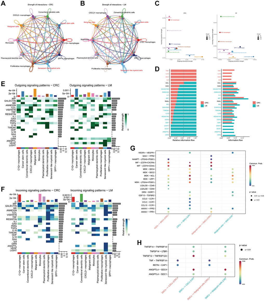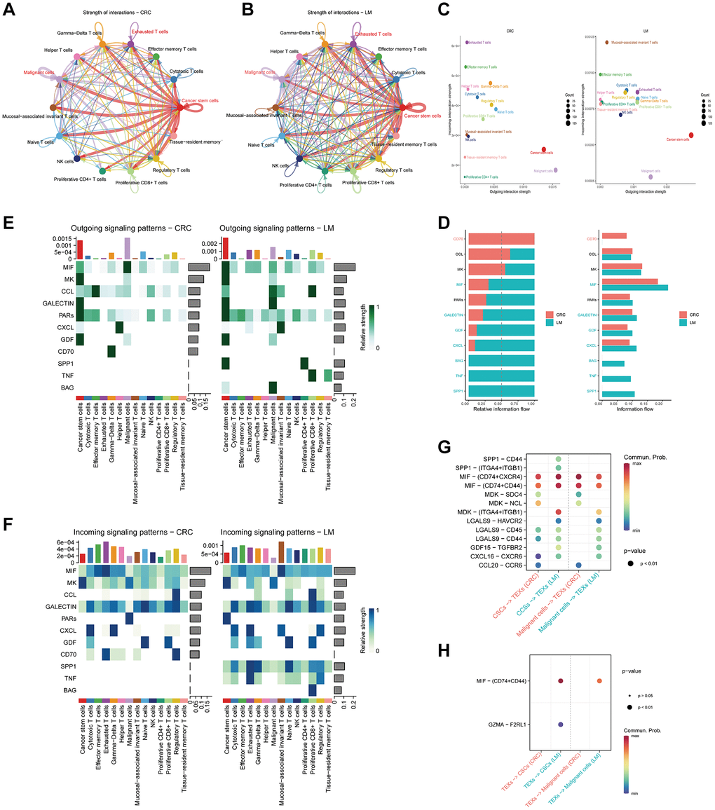 Our investigation then extended to the creation of a cell communication network for NK/T cells. It is evident that the overall interaction strength in pCRC (Figure 6A) was comparatively lower than that in LM (Figure 6B). Bubble plots, detailing the strength of outgoing and incoming signals, are depicted in Figure 6C. These representations underscored a conspicuous difference: TEXs and CSCs in LM exhibited notably heightened outgoing and incoming signal strengths in comparison to their pCRC counterparts, with TEXs displaying a particularly prominent surge in outgoing signal strength. A broader examination of the overarching signaling patterns (Figure 6D) revealed that pCRC exhibited more robust signaling in CD70, whereas LM displayed heightened signaling in several secretory factors, including MIF, BAG, TNF, and SPP1. Subsequent scrutiny of the outgoing (Figure 6E) and incoming (Figure 6F) signal strength of secretory factors across diverse cell subtypes unveiled that, relative to pCRC, LM displayed heightened outgoing signal strength for MIF in TEXs, and an increased outgoing of SPP1, GALECTIN, and BAG in CSCs and malignant cells. In terms of incoming signals, TEXs in LM demonstrated a higher signal strength for TNF, SPP1, and CXCL in comparison to their pCRC counterparts, while CSCs displayed an elevated PARs signaling strength. Finally, bubble plots (Figure 6G) portraying the differences in ligand-receptor signal pair strengths between pCRC and LM demonstrated variations in the intensity of signal regulation by tumor cells in TEXs. Specifically, when compared to pCRC, LM exhibited higher signal strength in pairings such as SPP1-CD44/(ITGA4+ITGB1), MDK-(ITGA4+ITGB1), and GDF15-TGFBR2, while signal strength in MDK-SDC4/NCL pairings was lower. In the context of signal regulation by TEXs in tumor cells (Figure 6H), our findings pointed to MIF-(CD74+CD44) as a significantly more potent regulatory signal, playing a pivotal role in driving malignant tumors.